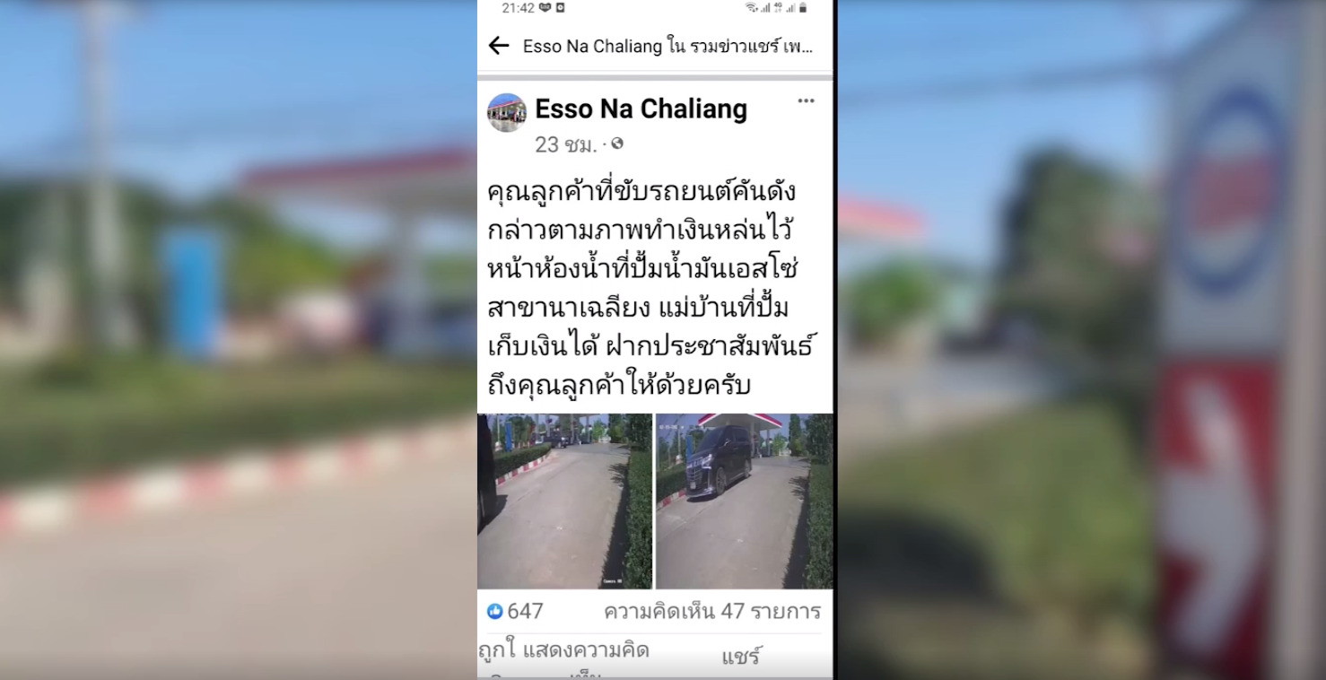 ผู้ใช้เฟซบุ๊กที่ใช้ชื่อว่า “Esso NaChaliang” ซึ่งเป็นเจ้าของสถานีบริการน้ำมันแห่งหนึ่งในพื้นที่ ต.นาเฉลียง อ.หนองไผ่ จ.เพชรบูรณ์ โพสต์ข้อความว่า “คุณลูกค้าที่ขับรถยนต์คันดังกล่าวตามภาพทำเงินหล่นไว้หน้าห้องน้ำที่ปั๊มน้ำมันเอสโซ่ สาขานาเฉลียง แม่บ้านที่ปั๊มเก็บเงินได้ ฝากประชาสัมพันธ์ถึงคุณลูกค้าให้ด้วยครับ” และ “ประชาสัมพันธ์ถึงคุณลูกค้าขับรถยนต์ทะเบียน 2กล3416 กรุงเทพมหานคร คุณลูกค้าเติมน้ำมันแล้วลืมบัตรเครดิตไว้กรุณามาติดต่อรับบัตรคืนได้ที่ปั๊มน้ำมันเอสโซ่นาเฉลียงครับ” มีผู้คนเข้ามาแสดงความชื่นชมกันอย่างมากมาย