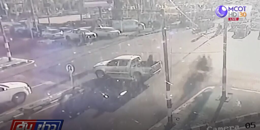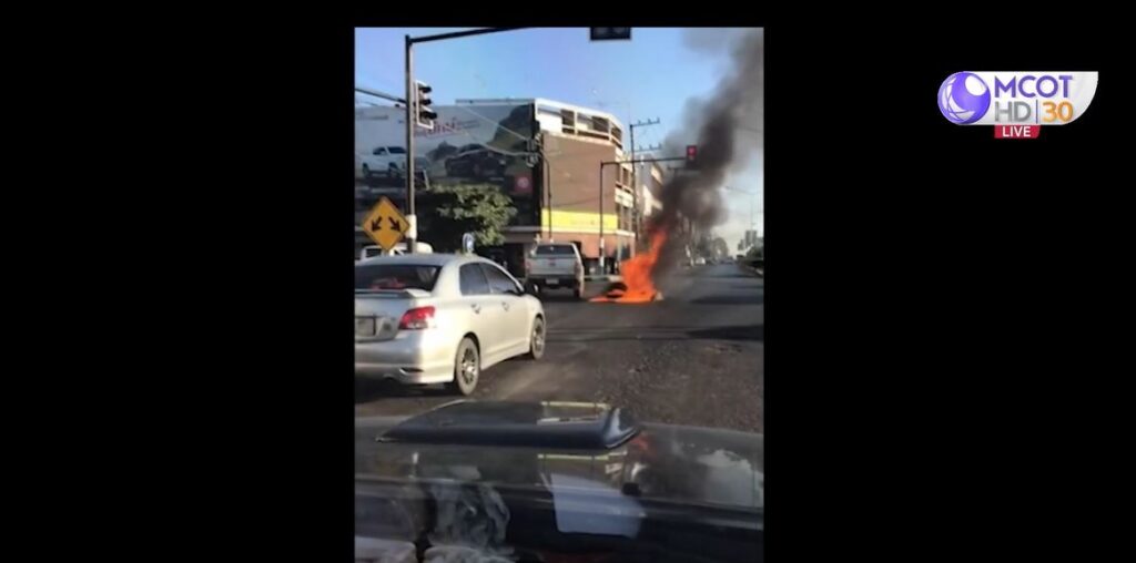 กรณีวงจรปิดบันทึกภาพหนุ่มขับรถกระบะ 4 ประตู นำยางที่อยู่ท้ายรถมาราดน้ำมัน ก่อนจุดไฟเผาที่สี่แยกไฟแดงกลางเมืองอำนาเจริญ