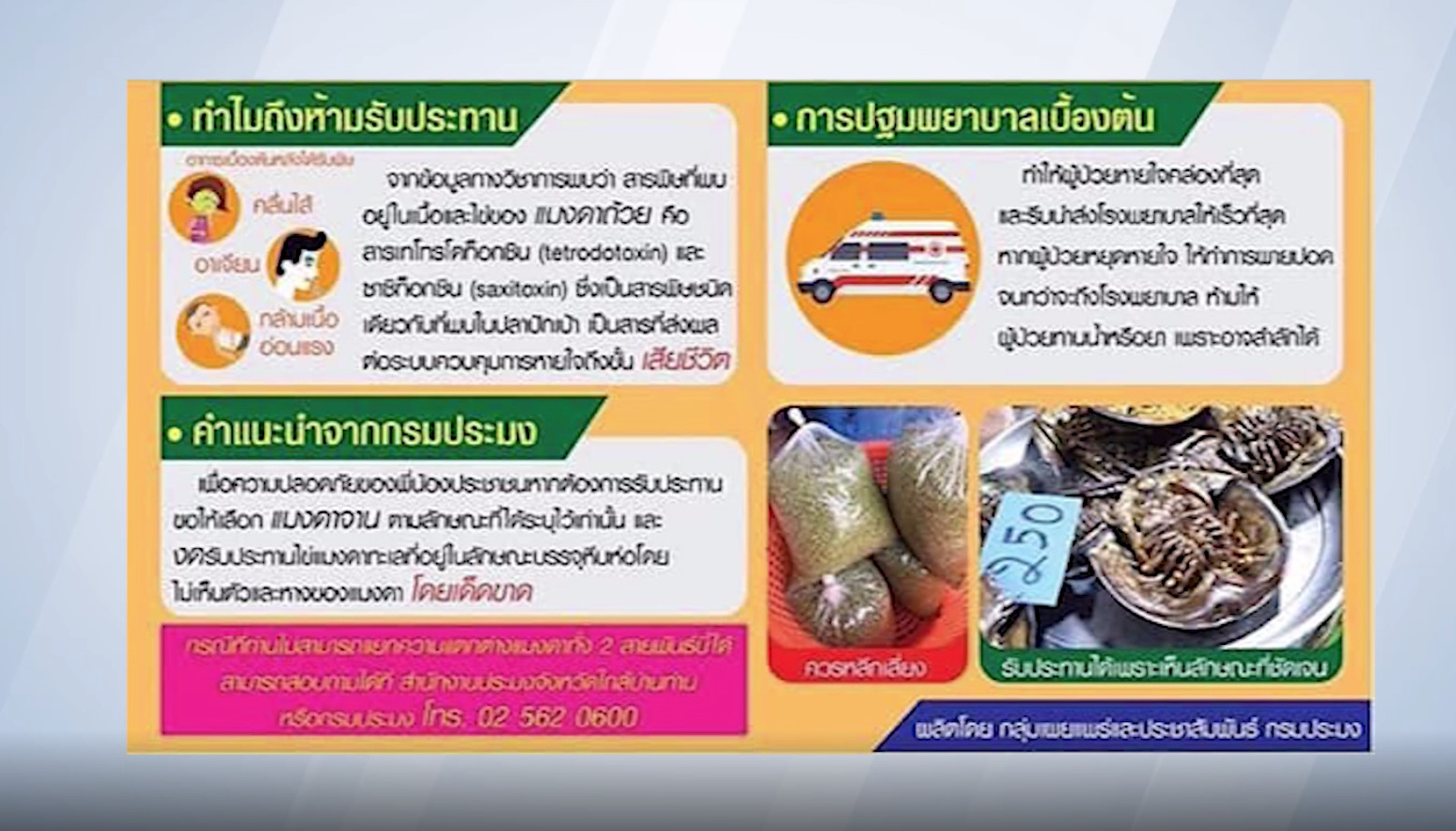 นางมีนา พลาเกตุ ภรรยาผู้เสียชีวิต ที่กำลังจัดเตรียมงานศพ เล่าว่าสามีดื่มสุรา และกินยำไข่แมงดาถ้วยกับเพื่อนบ้าน ในวันที่ 14 ธ.ค.ตั้งแต่ ประมาณ 10.00 น. จนกระทั่งประมาณ 22.30 น. เมื่อกลับมาถึงสามีบอกปวดหัว สงสัยเพราะดื่มเหล้ามาทั้งวัน จึงขอไปนอนโดยกินยาพาราก่อนจะนอนหลับไป จนกระทั่งเวลาประมาณเกือบเที่ยงคืน สามีได้ร้องขอความช่วยเหลือเสียงดังมากจนตนเองตกใจตื่น เริ่มมีอาการลิ้นแข็งพูดไม่ชัด แขนขาเริ่มมีอาการชาและอ่อนแรง ก่อนที่สามีจะร้องไห้และบอกว่าไม่น่ากินยำไข่แมงดาถ้วยเลย ตนเองจึงโทรหาพี่เขยให้มารับไปส่งโรงพยาบาลตราด และนอนรักษาอยู่ 3 คืน ซึ่งอาการมีแต่ทรุดลง เนื่องจากพิษของแมงดาถ้วยไปทำลายไตและตับ ระบบการทำงานภายในร่างกายล้มเหลว แม้ปั๊มหัวใจถึง 6 ครั้งก็ไม่อาจยื้อชีวิตได้.-สำนักข่าวไทย