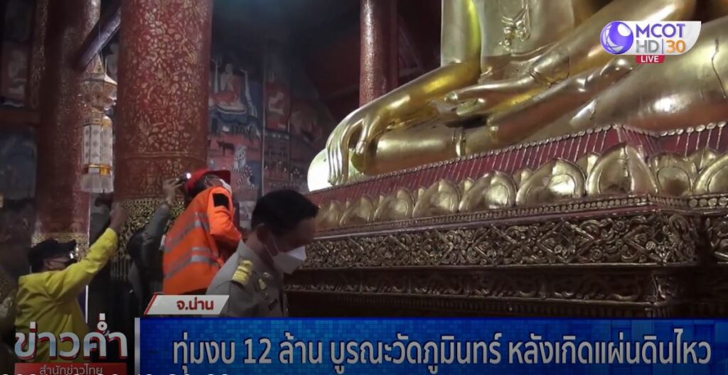 นายสถาพร เที่ยงธรรม ผู้อำนวยการสำนักศิลปากรที่ 7 เชียงใหม่ พร้อมด้วยนายเทอดศักดิ์ เย็นจุระ ผู้อำนวยการกลุ่มอนุรักษ์โบราณสถาน สำนักศิลปากรที่ 7 เชียงใหม่ เข้าตรวจองค์พระประธานจตุรพักต์ 4 ด้าน อายุ 425 ปี ที่ประดิษฐ์สถานอยู่ภายในพระอุโบสถวัดภูมินทร์ ซึ่งเป็นวัดเก่าแก่สำคัญของ จ.น่าน หลังได้รับความเสียหายจากแผ่นดินไหว ขนาด 5.8 ที่สาธารณรัฐประชาธิปไตยประชาชนลาว เมื่อเวลา 04.06 น. ของวันนี้