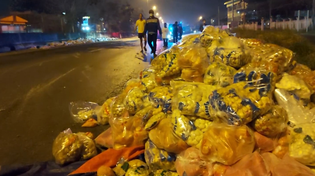 ที่เกิดเหตุพบรถกระบะ ทะเบียน 2 ฒฐ 678 กรุงเทพมหานคร สภาพรถยางหลังแตกเสียหายทั้ง 2 ล้อ ไฟหน้ารถแตก เจ้าหน้าที่ช่วยกันนำรถมาลากออกจากที่เกิดเหตุ จากการสอบถามนายพรชิต มณีศรี อายุ 32 ปี คนขับรถขนส่งลูกชิ้น เล่าว่า ตนกำลังขับรถไปส่งลูกชิ้นที่ตลาดสี่มุมเมือง รังสิต เมื่อถึงที่เกิดเหตุยางแตก ทำให้รถพลิกคว่ำ ลูกชิ้นกว่า 2 ตัน กระจายเต็มถนน เจ้าหน้าที่ต้องช่วยกันลำเลียงลูกชิ้นทั้งหมดออกจากถนน เพื่อเคลียร์การจราจร. – สำนักข่าวไทย