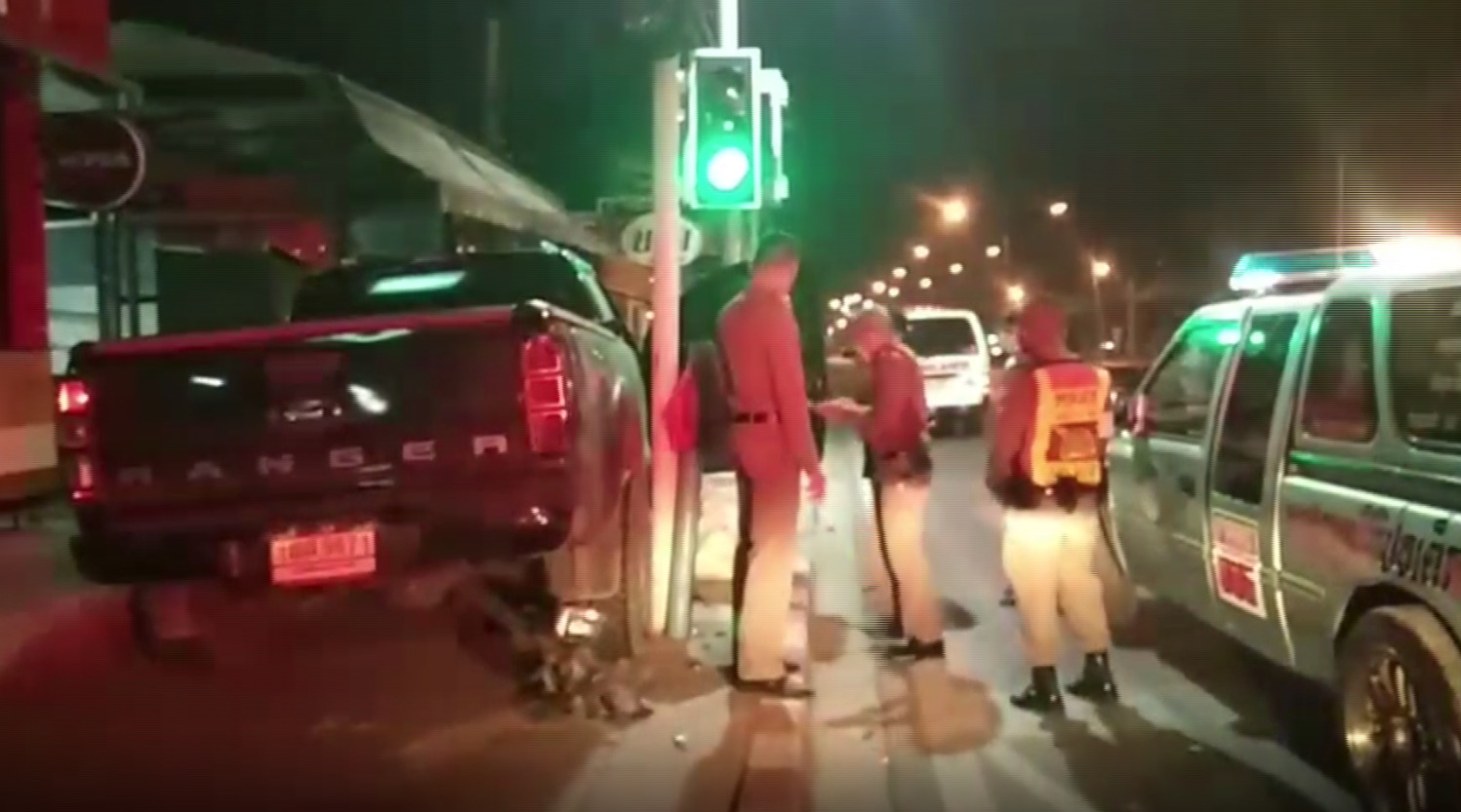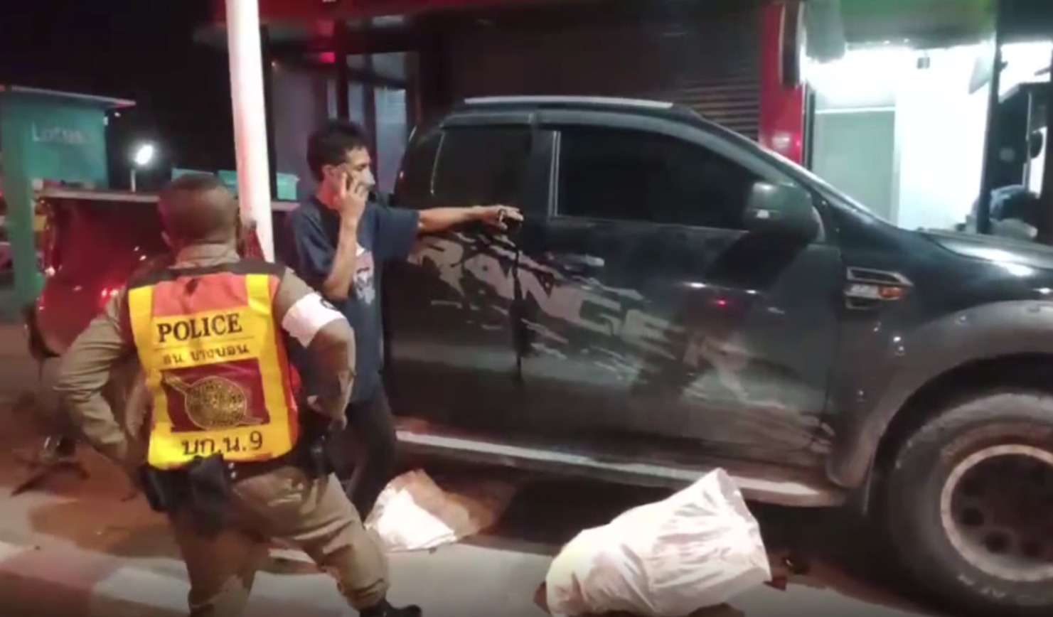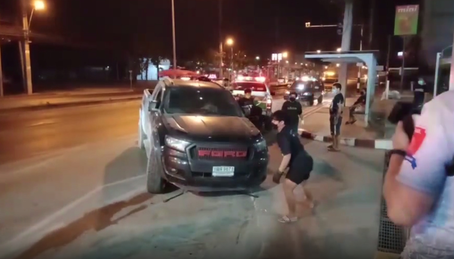 ภาพคนขับรถกระบะที่ตำรวจเรียกรถจากรถที่ปีนทางเท้า เหตุเกิดประมาณเที่ยงคืนที่ผ่านมา บริเวณหน้าร้านสะดวกซื้อแห่งหนึ่ง สาขาถนนเอกชัย ปากซอย 99/1 แขวงและเขตบางบอน กทม. ในที่เกิดเหตุพบรถกระบะปีนอยู่บนทางเท้า ล้อทั้ง 2 ข้างแตกยับ ตัวรถชนติดอยู่กับเสาไฟสัญญาณรอข้ามถนน ลักษณะเอียงได้รับความเสียหาย นอกจากนี้ยังมีผู้บาดเจ็บ 1 คน คือ น.ส.เกษศิรินทร์ อายุ 25 ปี เป็นพนักงานร้านสะดวกซื้อสาขาใกล้เคียงจุดเกิดเหตุ ที่กำลังเดินกลับบ้านพัก บาดเจ็บที่หัวเข่าและน่องซ้าย ส่วนผู้ขับขี่รถกระบะ ยังมีสติ รู้สึกตัวดี ไม่ได้รับบาดเจ็บ แต่เจ้าตัวเอาแต่นั่งอยู่ในรถ ไม่ยอมเปิดประตูลงจากรถและไม่พูดคุยกับใคร แม้เจ้าหน้าที่จะเกลี้ยกล่อมให้ลงมาคุยกัน และบอกว่าจะเรียกรถยกมายกรถไปที่โรงพัก คนขับก็ยังไม่ยอมเปิดประตูลงจากรถ