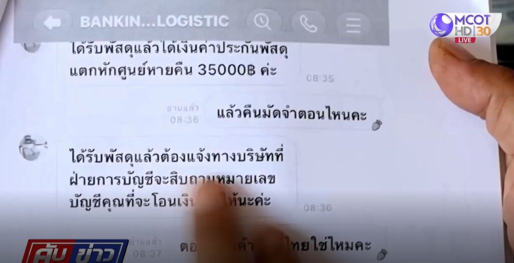 ต่อมาวันที่ 17 ธันวาคม มีผู้หญิงโทรมาหา อ้างเป็นเจ้าหน้าที่รับกล่องพัสดุ แจ้งว่ากล่องพัสดุที่ส่งมานั้นมีของแบรนด์เนมเป็นเพชร ทอง นาฬิกา และเครื่องประดับ ให้ตนจ่ายค่าภาษีนำเข้าสินค้าแบรนด์เนม 10,000 บาท และค่าประกันพัสดุแตกหักสูญหาย 35,000 บาท รวมเป็น 45,000 บาท แล้วจะส่งพัสดุมาให้ เมื่อตนได้รับพัสดุ หากสิ่งของไม่แตกหักสูญหายก็จะได้รับเงินคืน 35,000 บาท ตนจึงแชทไปบอกชายชาวเกาหลีว่าสิ่งของที่ส่งมาให้นั้นมีค่าใช้จ่าย จะให้พัสดุส่งคืนไป แต่เจ้าหน้าที่บอกไม่ส่งกลับ มีแต่ยึดทรัพย์สิน ทำให้ตนสงสารชายชาวเกาหลี จึงโอนเงินไปให้ทางบัญชีธนาคารหนึ่ง