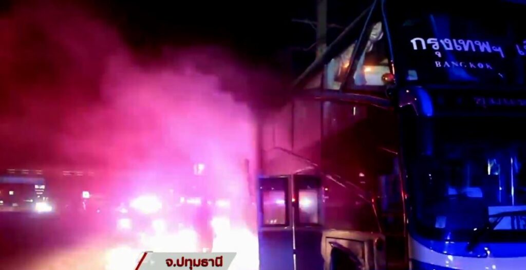 เมื่อช่วงเช้ามืดที่ผ่านมา รถโดยสารประจำทางสายกรุงเทพ-เลย เบรกติด ยางระเบิดไฟลุกบริเวณล้อรถ จอดอยู่ตรงข้ามมหาวิทยาลัยกรุงเทพ ถนนพหลโยธินขาเข้า อ.คลองหลวง จ.ปทุมธานี รถดับเพลิงเทศบาลเมืองคลองหลวง ฉีดน้ำสกัดไฟเพื่อไม่ให้ลุกลาม ส่วนผู้โดยสารพากันวิ่งหนีตายมารอด้านล่าง