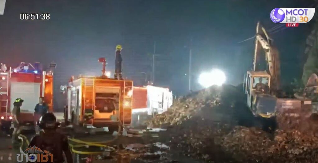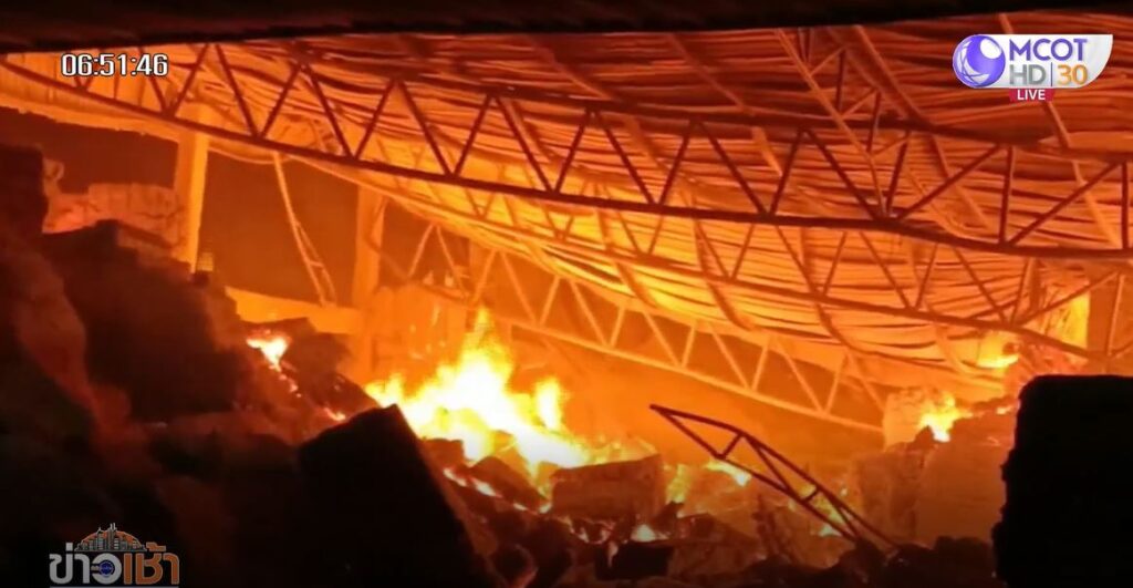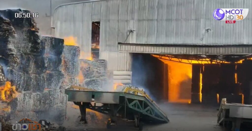 ชลบุรี 27 ธ.ค. – เหตุไฟไหม้โกดังอัดและเก็บกระดาษรีไซเคิล ของบริษัท ไทย พีส พัลพ์ (ไทยแลนด์) ใน อ.ศรีราชา จ.ชลบุรี เจ้าหน้าที่เร่งคุมเพลิงทั้งคืน เนื่องจากยังไม่สามารถเข้าไปดับไฟด้านในได้ เกรงหลังคาโกดังจะพังลงมาใส่เจ้าหน้าที่