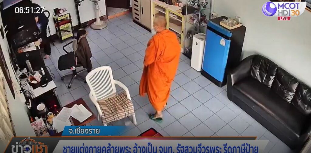 ภาพจากกล้องวงจรปิดภายในร้านรับถ่ายภาพพระเครื่องและเครื่องรางของขลังแห่งนึ่งในชุมชนหนองบัว ต.รอบเวียง อ.เมือง จ.เชียงราย มีชายแต่งกายคล้ายพระเข้ามาในร้านแล้วอ้างว่าเป็นเจ้าหน้าที่ของรัฐปลอมตัวมา เพื่อตรวจสอบการเสียภาษีป้ายโฆษณาหน้าร้าน และเลียบๆ เคียงๆ จะขอเรียกเก็บเงิน เมื่อเห็นกล้องวงจรปิดของร้านจึงรีบหนีออกจากร้านไป