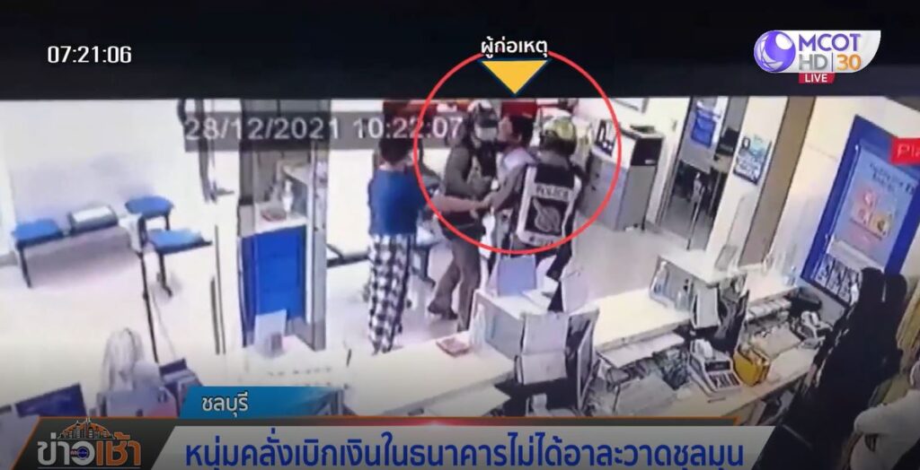 กล้องวงจรปิดของธนาคารแห่งหนึ่งใน ต.แสนสุข อ.เมือง ชลบุรี จะเห็นมีชายหนุ่มคนหนึ่งเดินไปมาอยู่ด้านหน้าเคาน์เตอร์ หลังจากนั้นโวยวายและมีตำรวจ 2 นาย รวมทั้ง รปภ. เข้ามาชวนคุยและพยายามพาออกไปด้านนอกธนาคาร แต่ชายคนดังกล่าวสะบัดมือหลุด ก่อนชกเข้าที่ใบหน้าของตำรวจทั้ง 2 นาย ก่อนเกิดการชุลมุนขึ้น จากนั้นเจ้าหน้าที่สามารถคุมตัวชายคลุ้มคลั่งรายนี้ไว้ได้ พบอายุ 30 ปี