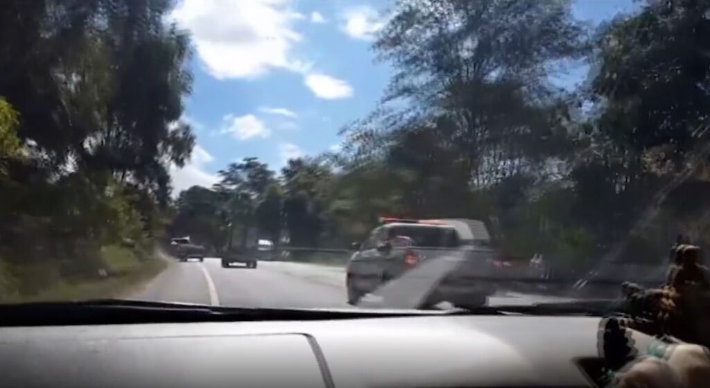ระหว่างนั้นเจ้าหน้าที่พบรถยนต์กระบะคันดังกล่าววิ่งมาจากทางด้านตลาดอำเภอทองผาภูมิ เจ้าหน้าที่ได้ขับรถยนต์ติดตามไปอย่างกระชั้นชิด โดยรถยนต์คันดังกล่าวขับหลบหนีด้วยความเร็วสูงประมาณ 170-180 กิโลเมตรต่อชั่วโมง เจ้าหน้าที่เห็นท่าไม่ดี เนื่องจากคนร้ายใช้ความเร็วสูง จึงประสาน ตม. อ.ไทรโยค เพื่อให้ช่วยกันสกัดจับ แต่ก็ไม่เป็นผล คนขับได้ขับแหกด่านด้วยวามเร็ว จากนั้นได้ประสานขอกำลังเจ้าหน้าที่ตำรวจ สภ.ลาดหญ้า อ.เมืองกาญจนบุรี เขาร่วมสมทบเพื่อสกัดจับบริเวณจุดหน้าป้อมตำรวจบ้านสามพราน แต่การสกัดจับก็ไม่เป็นผลเช่นกัน
