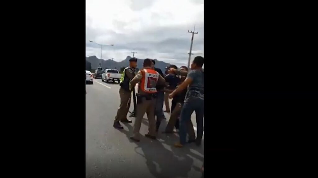ก่อนจะมาติดตามจับได้ บริเวณหน้าสวนเมเปิ้ล การ์เด้น หมู่ 4 ต.ลาดหญ้า อ.เมืองกาญจนบุรี ที่ขณะนั้นการจราจรหนาแน่น ทำให้รถของคนร้ายชะลอตัว เจ้าหน้าที่จึงตัดสินใจบุกจับ 2 สามีภรรยา โดยระหว่างที่เจ้าหน้าที่กำลังคุมตัวทั้งสองเอาไว้ ปรากฏว่าผู้เสียหายและญาติประมาณ 4-5 คน ที่ขับรถยนต์ติดตามมาตั้งแต่อำเภอทองผาภูมิ ได้ลงมาจากรถแล้ววิ่งไปลงมือตบตีสองสามีภรรยาด้วยความโมโห จนเกิดการชุลมุน