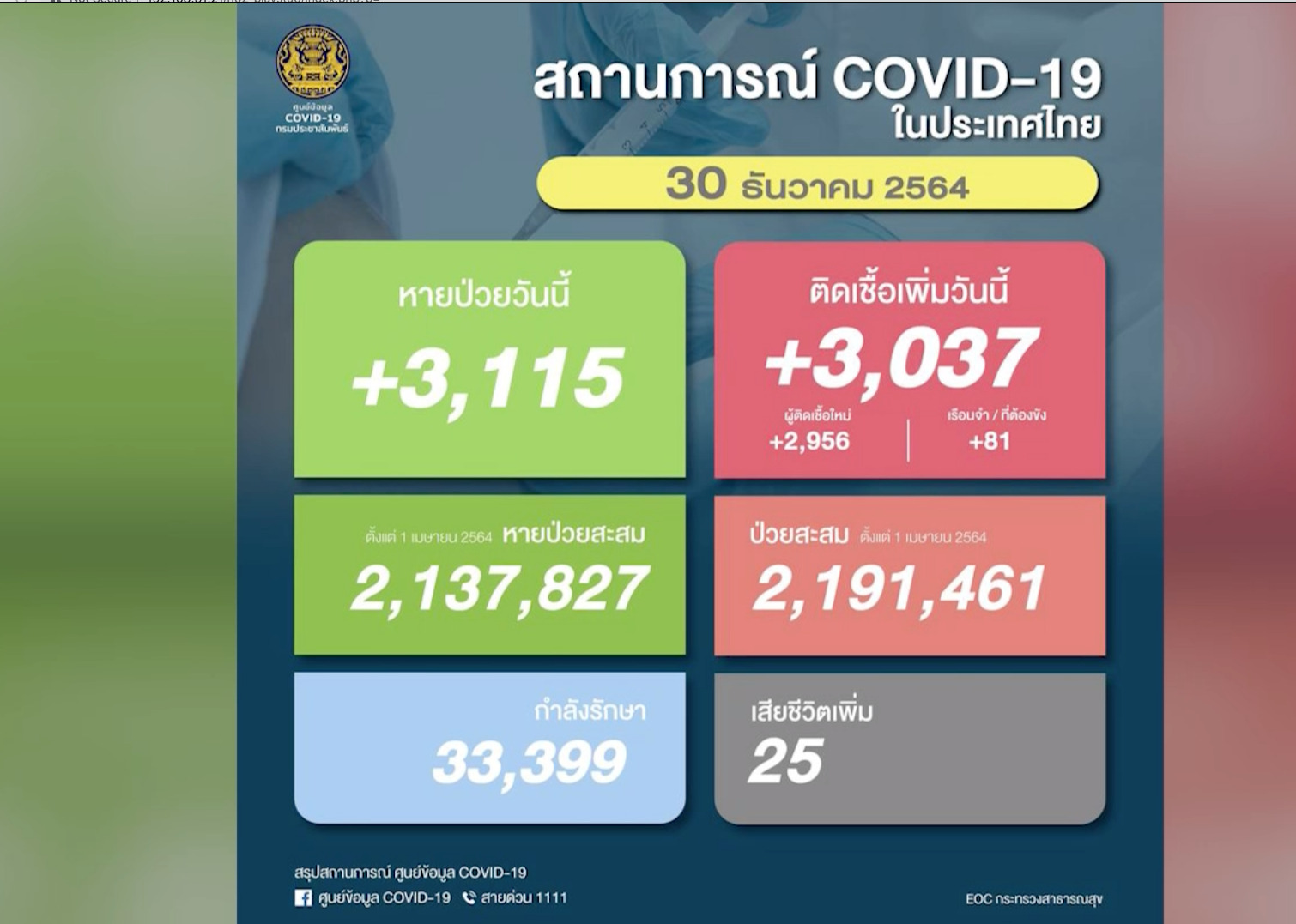 ขณะที่ศูนย์ข้อมูล COVID-19 ของรัฐบาล รายงานข้อมูลสถานการณ์ผู้ติดเชื้อโควิด-19 ประจำวันว่ามีผู้ติดเชื้อรายใหม่รวม 3,037 ราย เป็นผู้ป่วยจากระบบเฝ้าระวังฯ 2,794 ราย ผู้ป่วยจากการค้นหาเชิงรุก 50 ราย ผู้ป่วยภายในเรือนจำ/ที่ต้องขัง 81 ราย, ผู้ป่วยมาจากต่างประเทศ 112 ราย, ผู้ป่วยสะสม 2,191,461 ราย หายป่วยกลับบ้านเพิ่ม 3,115 ราย หายป่วยสะสม 2,137,827 ราย ผู้ป่วยกำลังรักษา 33,399 ราย และเสียชีวิตเพิ่ม 25 ราย.-สำนักข่าวไทย