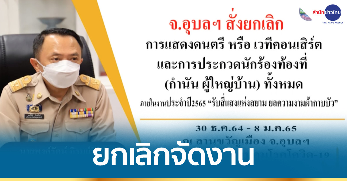 นายพงศ์รัตน์ ภิรมย์รัตน์ ผู้ว่าราชการจังหวัดอุบลราชธานี สั่งยกเลิกการแสดงคอนเสิร์ต และการประกวดร้องเพลงของนักร้องท้องถิ่นในงานกาชาดประจำปี 2565 ซึ่งจัดขึ้นรอบสวนสาธารณะทุ่งศรีเมือง และเริ่มงานวันแรกในวันนี้จนถึงวันที่ 8 ม.ค.2565 เพื่อสกัดการแพร่ระบาดของเชื้อโอไมครอน หลังพบมีผู้ป่วยโควิด-19 จากร้านอาหารกึ่งผับเอกมัย 487 ซึ่งเป็นการระบาดรอบที่สอง เพียง 5 วัน พบผู้ป่วยแบบก้าวกระโดดถึง 137 คน และมีกลุ่มเสี่ยงอีก 307 คน