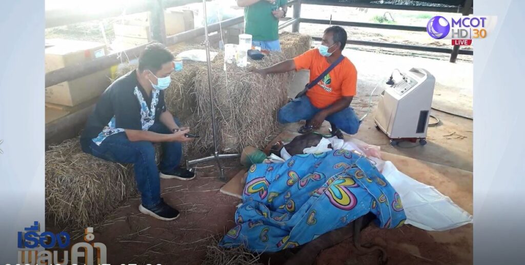 จากนั้นฉีดยาฆ่าเชื้อแก้ท้องเสีย ซึ่งมีอาการมา 2-3 วันก่อนหน้า ร่วมกับให้ยาลดไข้ ยาบำรุง และให้สารละลายทางหลอดเลือดดำ พร้อมให้ออกซิเจนอย่างต่อเนื่อง แล้วชั่งน้ำหนักได้ 105 กิโลกรัม โดยยังคงถ่ายเหลวรุนแรง ทำให้ร่างกายมีภาวะขาดน้ำ