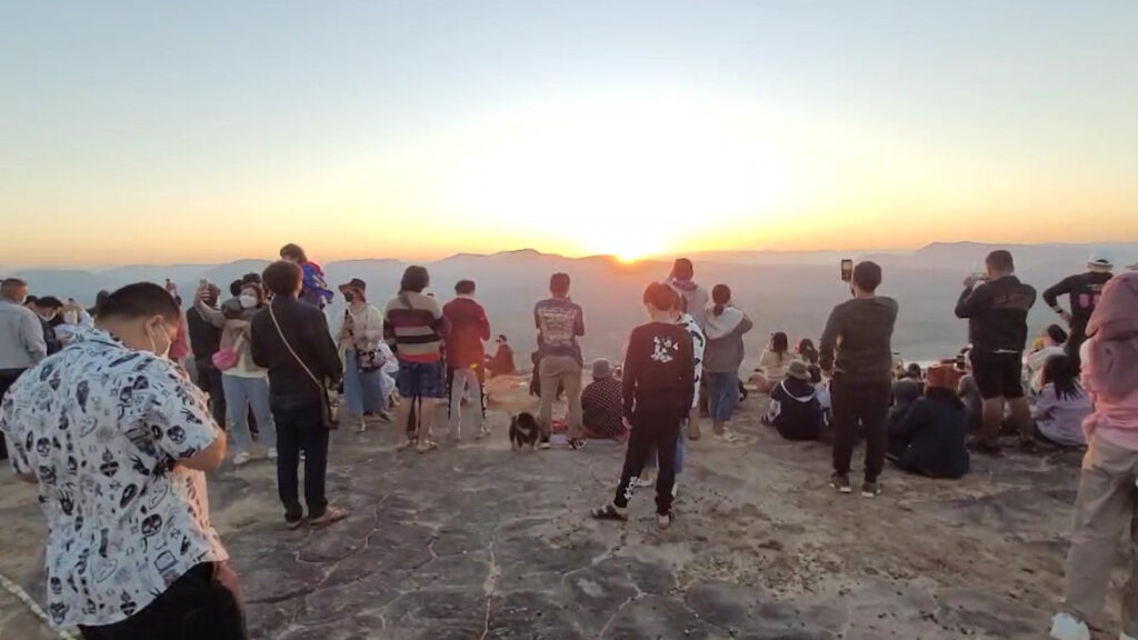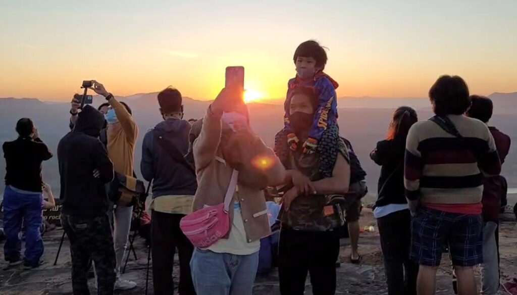 เมื่อพระอาทิตย์เริ่มทอแสงขึ้นมาจากหลังเทือกเขาของประเทศ สปป ลาว ก็เรียกเสียงพึงพอใจจากกลุ่มนักท่องเที่ยวที่พากันสวมเสื้อกันหนาว เอาผ้าห่มมาคลุมตัวนั่งรอชมท่ามกลางอากาศที่หนาวเย็นอุณหภูมิลดต่ำ 15 องศาเซลเซียส และยังมีลมพัดแรง โดยปีนี้พระอาทิตย์ขึ้นเมื่อเวลา 06.26 น.