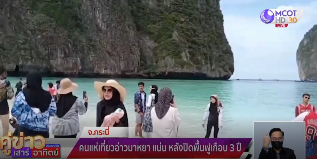 บรรยากาศที่อ่าวมาหยา ต.อ่าวนาง อ.เมือง จ.กระบี่ เขตอุทยานแห่งชาติหาดนพรัตน์ธารา-หมู่เกาะพีพี เป็นไปอย่างคึกคัก มีนักท่องเที่ยวเดินทางมาเที่ยวเป็นจำนวนมากจนแน่นหาด เรือเข้าออกเกือบจะตลอดเวลา หลังปิดอ่าวฟื้นฟูมานานเกือบ 3 ปี และเปิดให้เข้าเที่ยวได้เมื่อวานเป็นวันแรก ซึ่งไม่สร้างความผิดหวัง นักท่องเที่ยวต่างพูดเป็นเสียงเดียวกันว่าสวยงามมาก ดีใจที่ได้มา เพราะสวยงามกว่าที่คิด
