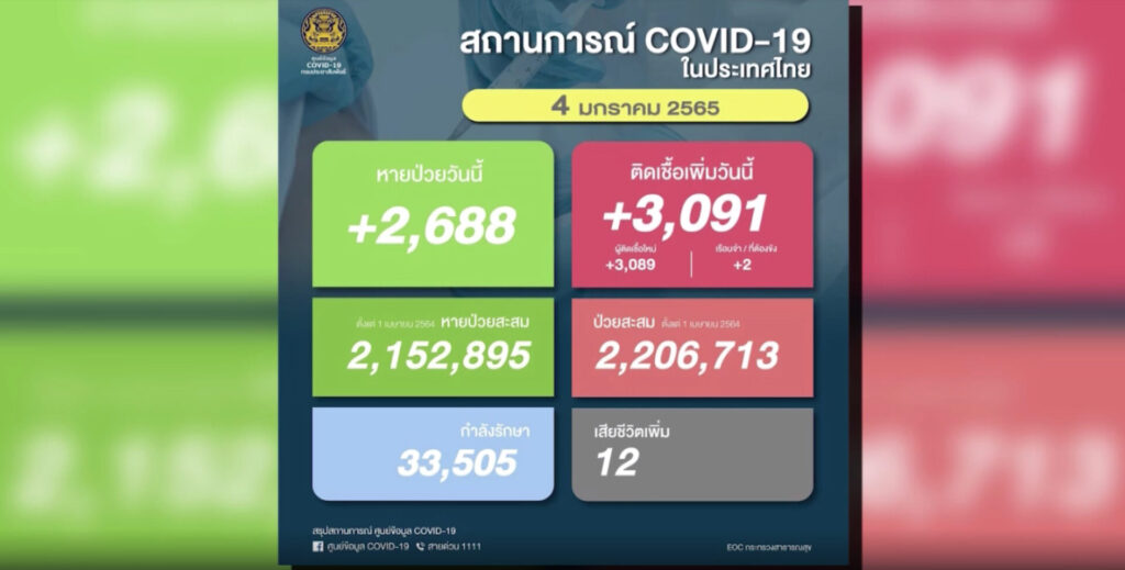ขณะนี้จังหวัดสงขลานั้นมีผู้ป่วยต่ำกว่า 100 คนต่อวัน มานานตั้งแต่ปลายเดือนธันวาคมที่ผ่านมา ขณะที่ภาพรวม ผู้ป่วยโควิด-19 ทั่วประเทศ ศูนย์ข้อมูล COVID-19 รายงานล่าสุดมีผู้ติดเชื้อรายใหม่ รวม 3,091 ราย โดยแบ่งเป็นผู้ป่วยจากระบบเฝ้าระวังฯ 2,963 ราย ผู้ป่วยจากการค้นหาเชิงรุก 2 ราย ผู้ป่วยภายในเรือนจำ/ที่ต้องขัง 2 ราย และผู้ป่วยมาจากต่างประเทศ 124 ราย มีผู้เสียชีวิตอีก 12 ราย ขณะเดียวกันมีผู้ป่วยรักษาหายกลับบ้านได้ 2,688 ราย รวมรักษาหายกลับบ้านแล้ว 2,180,321 ราย .-สำนักข่าวไทย