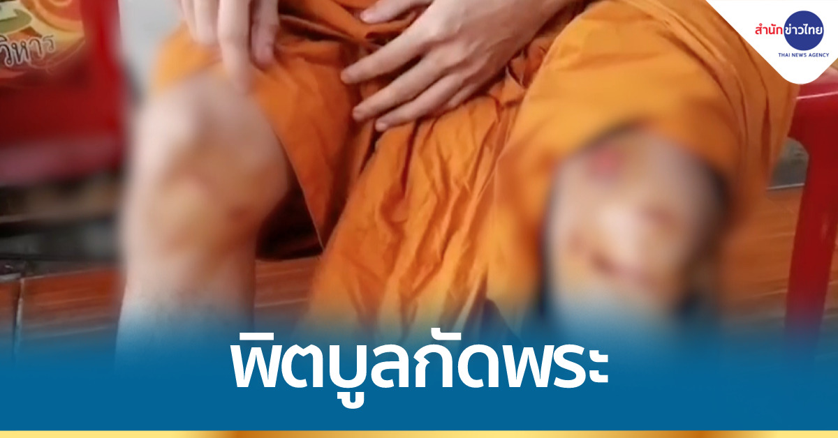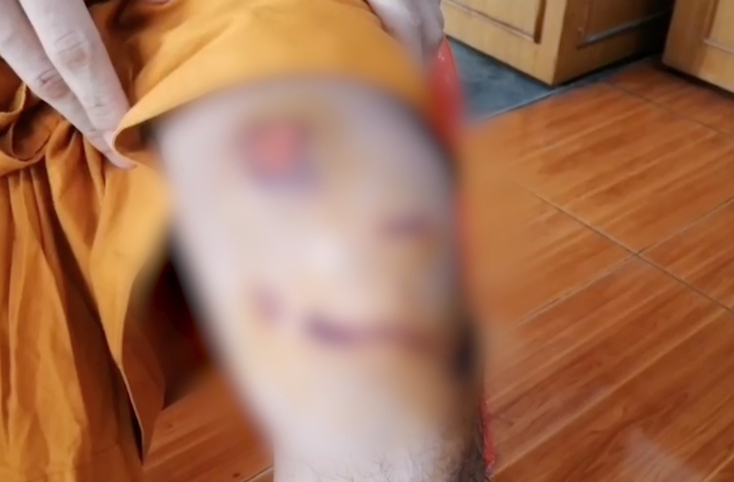 ปทุมธานี 4 ม.ค.- พระทัศนะ พระลูกวัดเปรมประชากร เปิดบาดแผลที่หัวเข่าทั้งสองข้างให้ดูว่าหกล้ม หลังถูกพิตบูลหลุดออกจากบ้านวิ่งเข้ามากัดขณะกำลังบิณฑบาตในหมู่บ้านรัตนโกสินทร์ 200 ปี รังสิต-ปทุมธานี 14 ซอย 17 อ.ธัญบุรี จ.ปทุมธานี