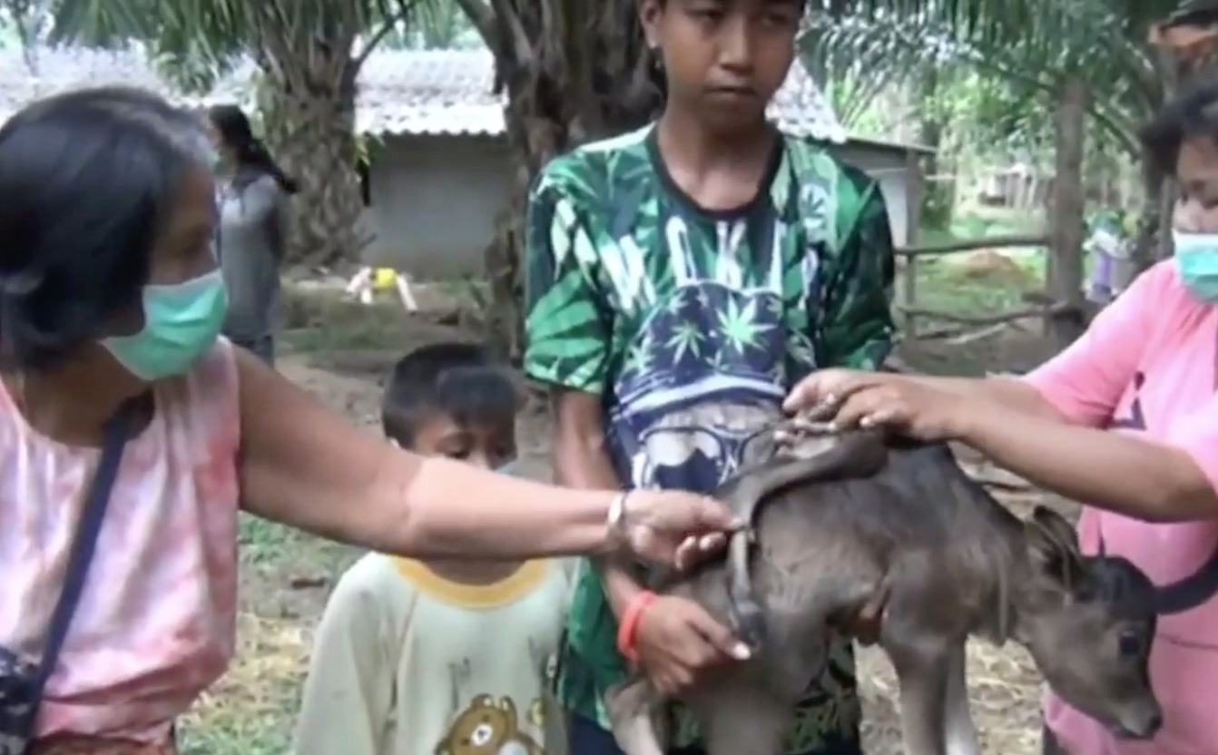 ผู้สื่อข่าวรับแจ้งจากชาวบ้านตำบลวังคีรี อ.ห้วยยอด จ.ตรังว่า มีแม่วัวคลอดลูกวัว ออกมามีจำนวน 6 ขา จึงลงพื้นที่ไปยังบ้านเลขที่194 หมู่ 4 บ้านเขาแก้ว ต.วังคีรี อ.ห้วยยอด จ.ตรัง ซึ่งเป็นบ้านของนางอารมณ์ สุขสนาน หรือพี่ดำ อายุ 49 ปี เจ้าของวัวตัวดังกล่าว ชาวบ้านต่างกำลังมุงดูลูกวัว เพศเมีย อายุ 4 วัน ชื่อน้องปีใหม่ สีน้ำตาล-ดำ ที่กำลังดูดน้ำนมของแม่ ชื่อว่าเจ้าลางสาด อายุ 6 ปี อยู่ภายในสวนปาล์มน้ำมันข้างบ้านหลังดังกล่าว