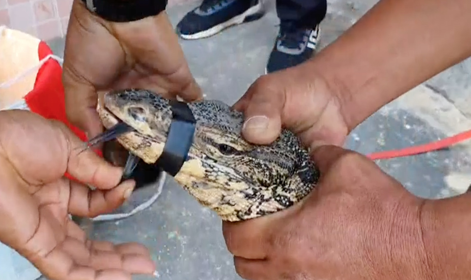 เจ้าหน้าที่กู้ภัยฯ เมื่อมาถึง เดินทางคว้าคอ จับมัดปาก มัดมือ มัดแขน แบบชิวๆ ก่อนจับใส่รถ เพื่อนำปล่อยคืนสู่ธรรมชาติ ท่ามกลางสายตาของทหารรบพิเศษที่มองดูความสามารถของกู้ภัยฯ แบบเขินๆ