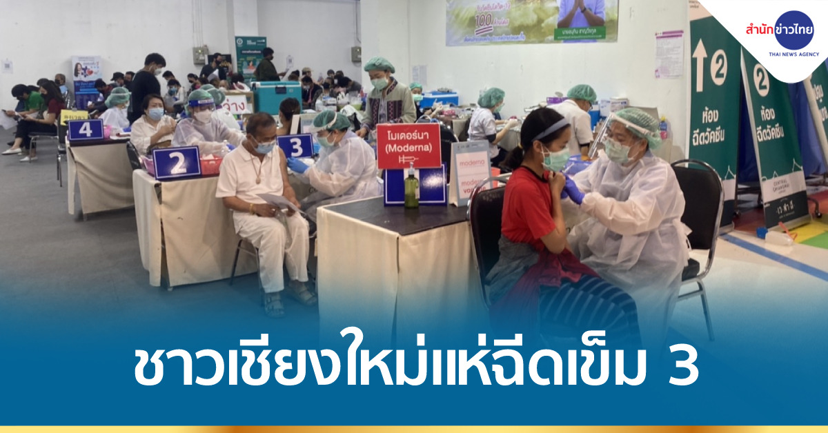 ขณะที่ชาวเชียงใหม่ที่ยังไม่ได้รับการฉีดวัคซีนเข็ม 3 วันนี้ต่างพากันไปฉีดวัคซีนตามโรงพยาบาลและจุดบริการฉีดวัคซีนต่างๆ กันเป็นจำนวนมาก ทำให้หลายที่คิวเต็มตั้งแต่ช่วงเช้า.-สำนักข่าวไทย