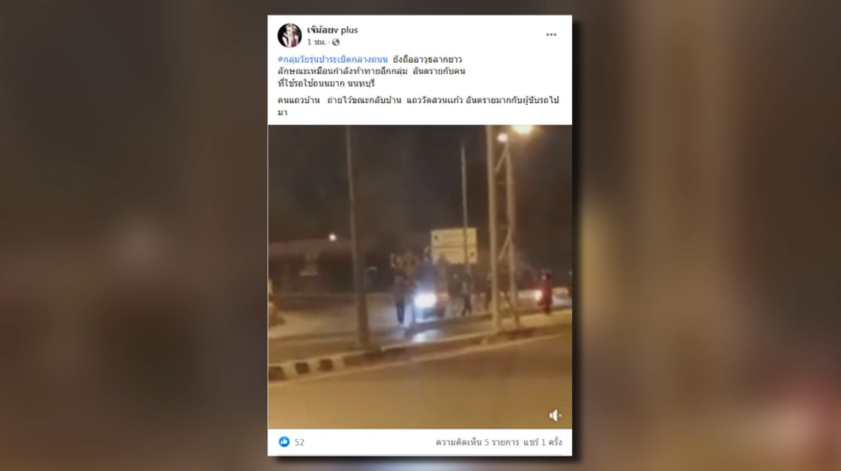 นี่เป็นคลิปที่เพจ “เจ๊ม้อย v plus” นำมาเผยแพร่ พร้อมข้อความว่า “กลุ่มวัยรุ่นปาระเบิดกลางถนน ยังถืออาวุธลากยาว ลักษณะเหมือนกำลังท้าทายอีกกลุ่ม อันตรายกับคนที่ใช้รถใช้ถนนมาก นนทบุรี คนแถวบ้านถ่ายไว้ขณะกลับบ้าน แถววัดสวนเเก้ว อันตรายมากกับผู้ขับรถไปมา”