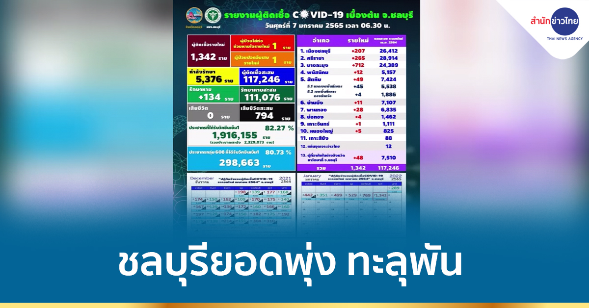จังหวัดชลบุรีติดเชื้อโควิด-19 วันนี้ทะลุพันคนแล้ว หลังจากวานนี้มีจำนวน 769 คน โดยสำนักงานสาธารณสุขจังหวัดชลบุรี รายงานสถานการณ์ประจำวันที่ 7 มกราคม มีผู้ติดเชื้อรายใหม่จำนวน 1,342 คน มีทั้งผู้ที่พักอาศัยในจังหวัดระยอง เข้ามารักษาใน จังหวัดชลบุรี คลัสเตอร์ตรวจเชิงรุกร้านอาหารและเครื่องดื่มที่จำหน่ายแอลกอฮอล์ คลัสเตอร์บริษัทเอกชน คลัสเตอร์มหาวิทยาลัยและบุคลากรทางการแพทย์ เตือนการระบาดของสายพันธุ์โอไมครอนรวดเร็ว ขอให้ทุกภาคส่วนปฏิบัติตามมาตรการควบคุมโรคของจังหวัด ค้นให้มาก กักให้ดี ชีวิตวิถีใหม่ ร่วมใจฉีดวัคซีน ขณะที่ภาพรวมสถานการณ์โควิดในประเทศไทยวันนี้ มีจำนวนผู้ติดเชื้อเพิ่ม 7,526 คน เสียชีวิต 19 คน .-สำนักข่าวไทย