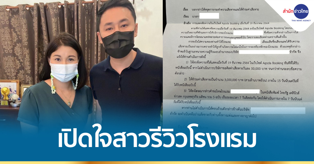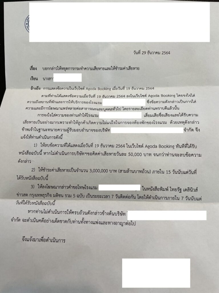 จากกรณีที่คุณขิง หญิงสาวซึ่งอาศัยอยู่ในจังหวัดชัยนาทไปรีวิวการเข้าใช้บริการของโรงแรมแห่งหนึ่งที่เขาใหญ่ แต่ทางโรงแรมกลับส่งหนังสือมาถึงเธอแจ้งให้ลบการรีวิว พร้อมกับขู่เรียกค่าเสียหาย 3 ล้านบาท