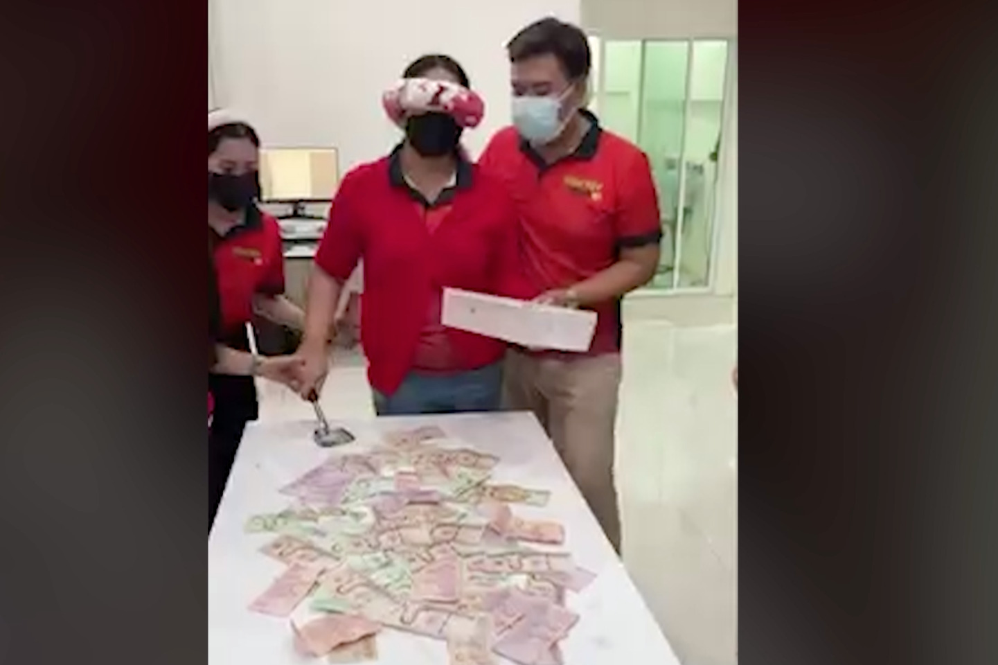 ชลบุรี 7 ม.ค.- เห็นแล้วต้องบอกว่าอิจฉาพนักงานร้านนี้มากๆ เพราะเจ้าของร้านใจดี แจกของขวัญปีใหม่ เปย์หนักจัดเต็ม ให้กับพนักงานเล่นเกมปิดตา ตักเงิน ตักได้เท่าไหร่ ก็เอาไปเลย งานนี้พนักงานรวยกันอู้ฟู่เลยจริงๆ