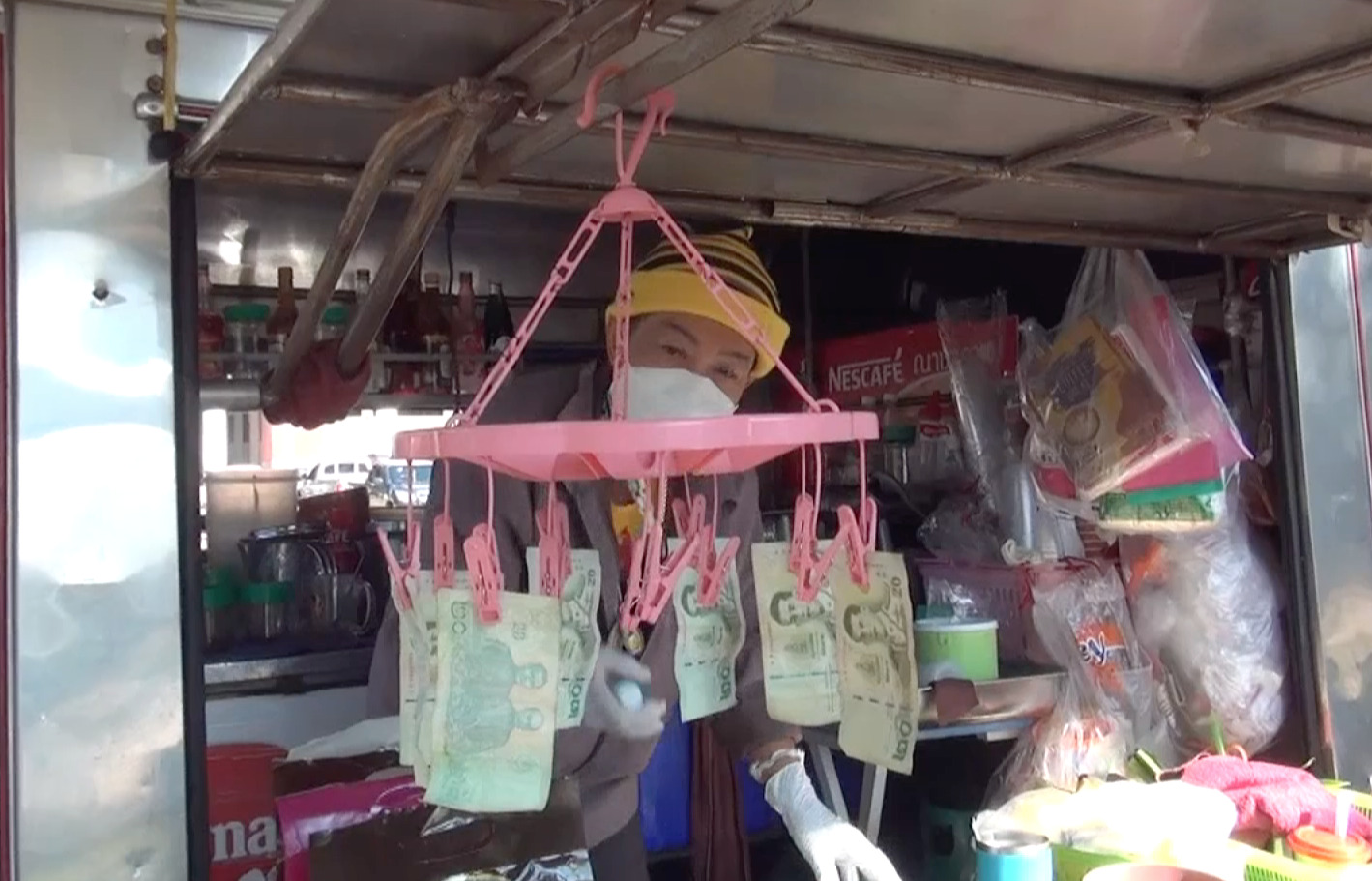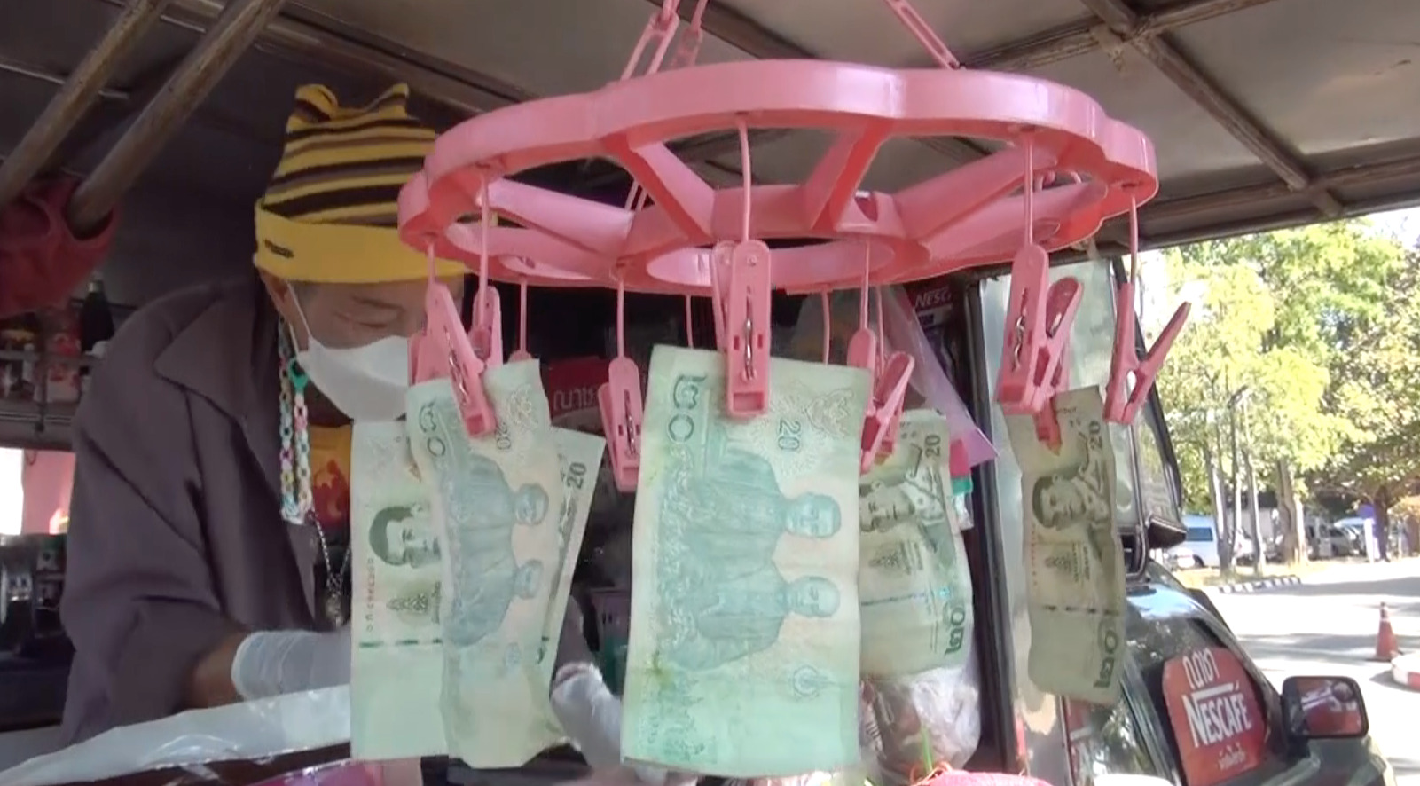 เชียงใหม่ 23 ม.ค.- แม่ค้ากาแฟเชียงใหม่ เป็นแบบอย่างที่ดีในการป้องกันโควิด-19 แบบครอบจักรวาล นำธนบัตรที่รับมาจากลูกค้าพ่นสเปรย์แอลกอฮอล์ทุกครั้ง วันละไม่ต่ำกว่า 50 ครั้งตามจำนวนลูกค้า และยังนำไปหนีบกับไม้แขวนเสื้อตากแดดฆ่าเชื้อ