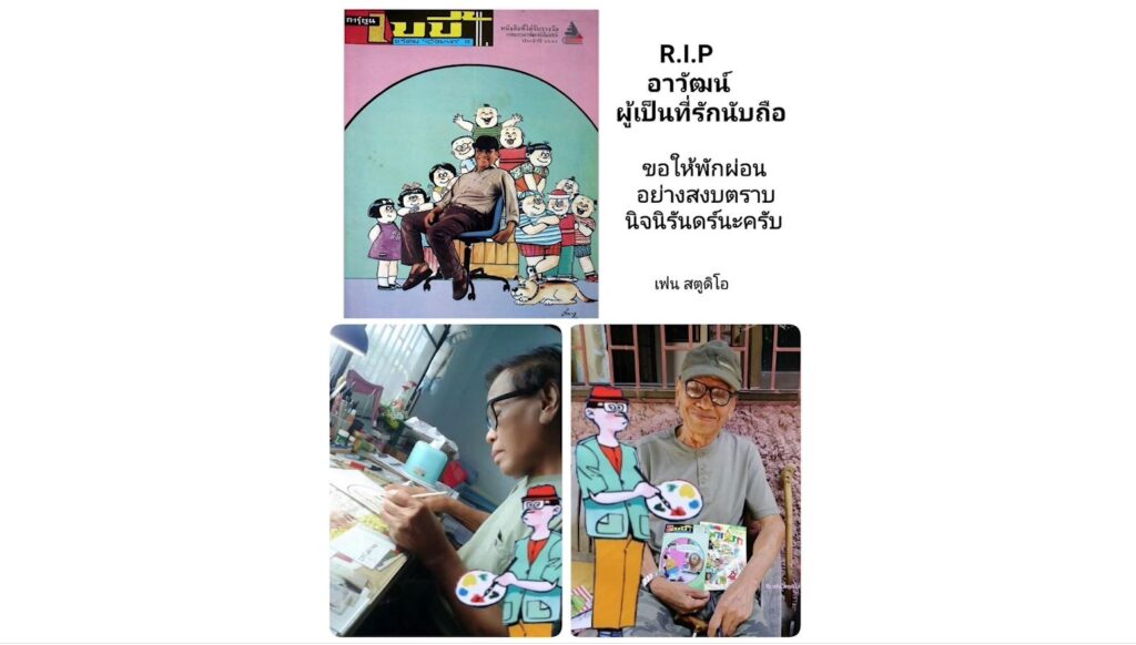 ขณะที่เฟซบุ๊ก “เฟน สตูดิโอ ครับ” ของอารีเฟน ฮะซานี หนึ่งในทีมนักเขียนขายหัวเราะ ที่มีโอกาสทำงานร่วมกับอาวัฒน์ ได้โพสต์ภาพพร้อมข้อความ R.I.P อาวัฒน์ แห่งการ์ตูน เบบี้ และขายหัวเราะ ได้เสียชีวิตอย่างสงบแล้วที่ จ.อุทัยธานี เมื่อเช้าวันที่11 ม.ค 65 สิริรวมอายุ 90 ปี ขอให้อาวัฒน์ ผู้เป็นที่รักและนับถือ หลับอย่างสงบ ตราบนิจนิรันดร์นะครับ