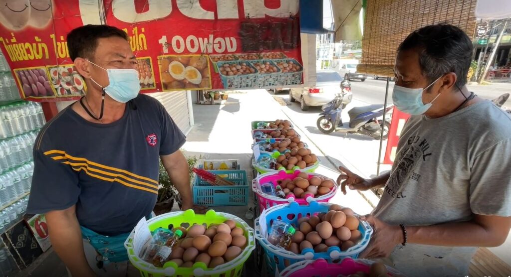 ผู้สื่อข่าวเดินทางไปสำรวจต่อยังร้านไข่ไก่ต้มแก้บน บนถนนเทพคุณากร ไปยังร้านไข่ต้มเจ้ใหม่ พ่อค้าขายไข่ต้ม เปิดเผยว่า ตอนนี้มีการปรับขึ้นราคาไข่ไก่ต้มแล้ว ตะกร้าละ 10-20 บาท ตามแต่ขนาดของไข่ ส่วนสาเหตุที่ต้องปรับขึ้นนั้น เพราะร้านของตนเองรับไข่ไก่มาจากหน้าฟาร์ม ที่มีการปรับขึ้นราคาก่อนหน้านี้ ถ้าพวกตนเองไม่ปรับราคาขายก็อยู่ไม่ได้ ไหนจะค่าแก๊สในการต้มก็จะปรับขึ้นราคา ยอมรับว่ามีผลกระทบเป็นอย่างมาก แต่ในช่วงวันสองวันนี้ยังเป็นวันธรรมดา ไม่ค่อยมีนักท่องเที่ยวมาซื้อไข่แก้บนมากนัก คงต้องรอดูวันเสาร์-อาทิตย์ ที่กำลังจะมาถึงนี้ จะยอดการซื้อจะลดน้อยลงไปหรือไม่