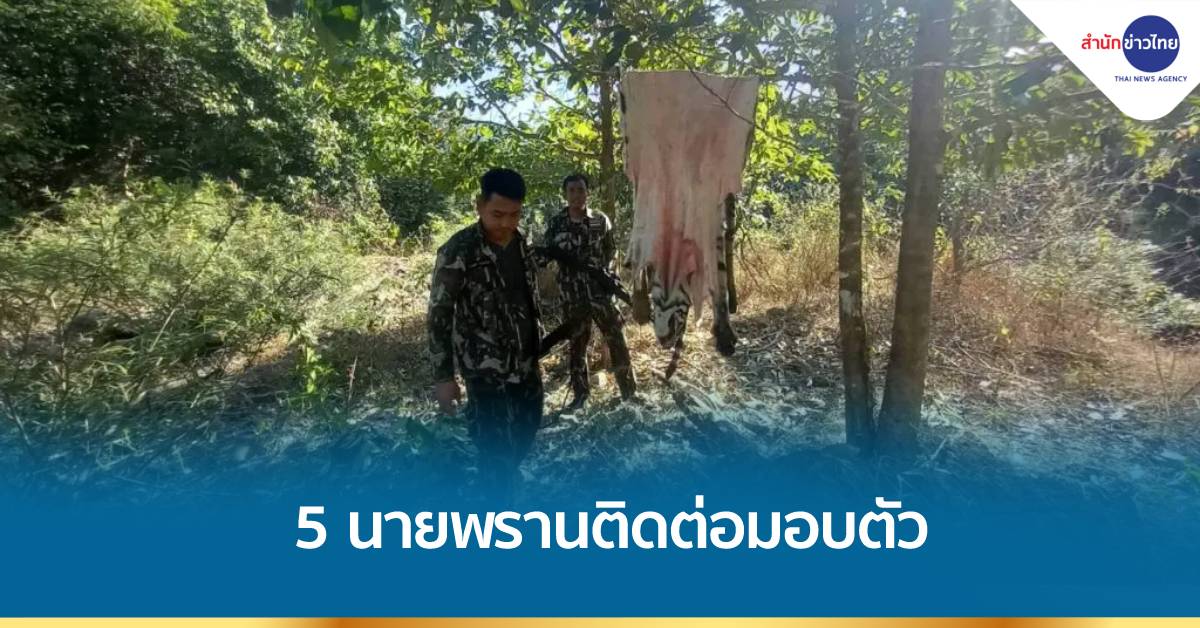 กาญจนบุรี 13 ม.ค.-พราน 5 คนติดต่อขอมอบตัวแล้ว หลังเจ้าหน้าที่พบการตั้งแคมป์และมีซากสัตว์ ซากเสือโคร่ง 2 ซาก บริเวณป่าห้วยปิล๊อก เขตอุทยานแห่งชาติทองผาภูมิ จ.กาญจนบุรี