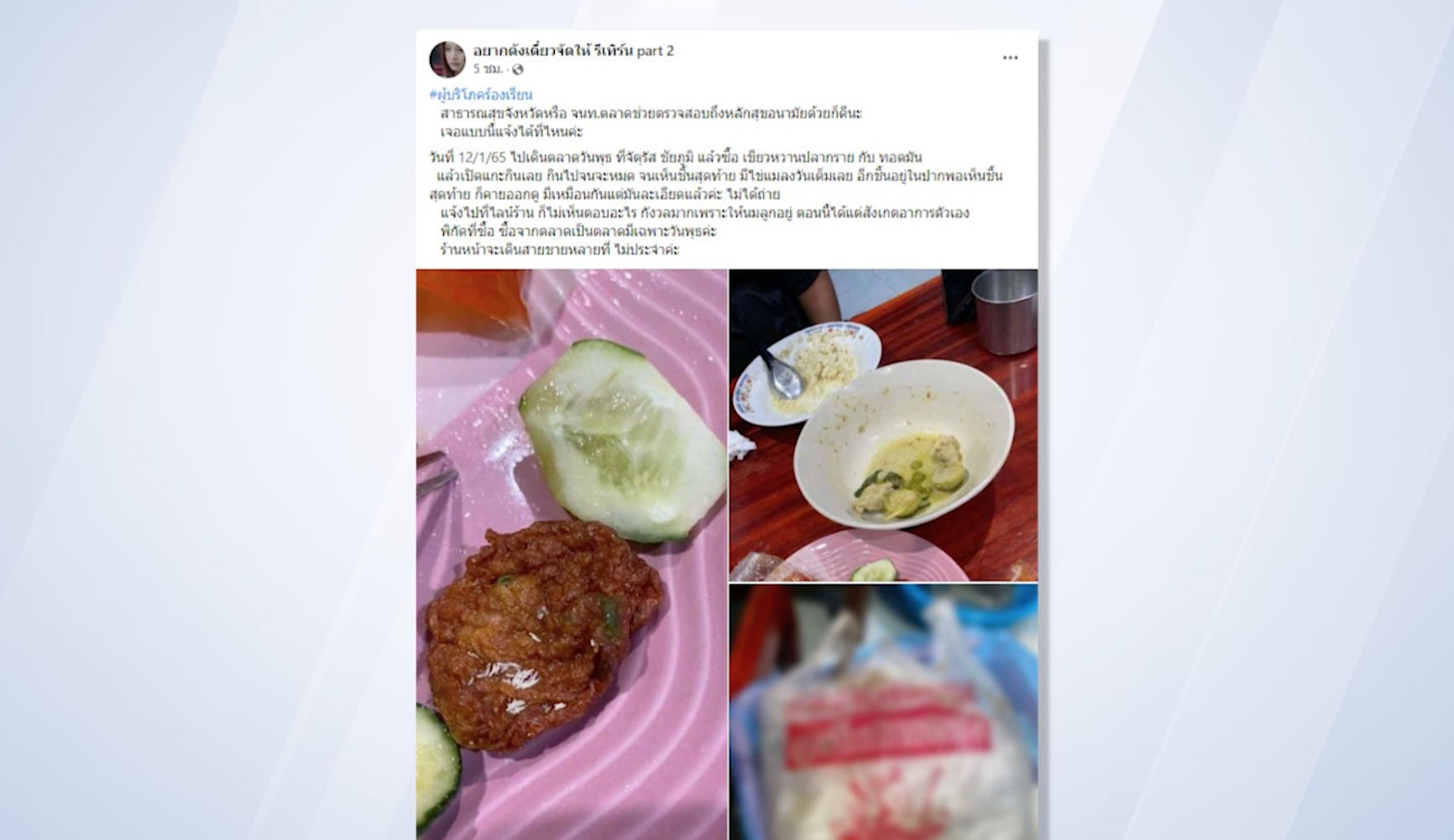เพจอยากดังเดี๋ยวจัดให้ รีเทิร์น part 2 โพสต์เรื่องราวชวนสยอง ของแม่ลูกอ่อนรายหนึ่งว่า“#ผู้บริโภคร้องเรียน สาธารณสุขจังหวัดหรือ เจ้าหน้าที่ตลาดช่วยตรวจสอบถึงหลักสุขอนามัยด้วยก็ดีนะ เจอแบบนี้แจ้งได้ที่ไหนคะ วันที่ 12/1/65 ไปเดินตลาดวันพุธ ที่จัตุรัส ชัยภูมิ แล้วซื้อ เขียวหวานปลากราย กับ ทอดมัน แล้วเปิดแกะกินเลย กินไปจนจะหมด จนเห็นชิ้นสุดท้าย มีไข่แมลงวันเต็มเลย อีกชิ้นอยู่ในปากพอเห็นชิ้นสุดท้าย ก็คายออกดู มีเหมือนกันแต่มันละเอียดแล้วค่ะ ไม่ได้ถ่าย แจ้งไปที่ไลน์ร้าน ก็ไม่เห็นตอบอะไร กังวลมากเพราะให้นมลูกอยู่ ตอนนี้ได้แต่สังเกตอาการตัวเอง พิกัดที่ซื้อ ซื้อจากตลาดเป็นตลาดมีเฉพาะวันพุธค่ะ ร้านหน้าจะเดินสายขายหลายที่ ไม่ประจำค่ะ”