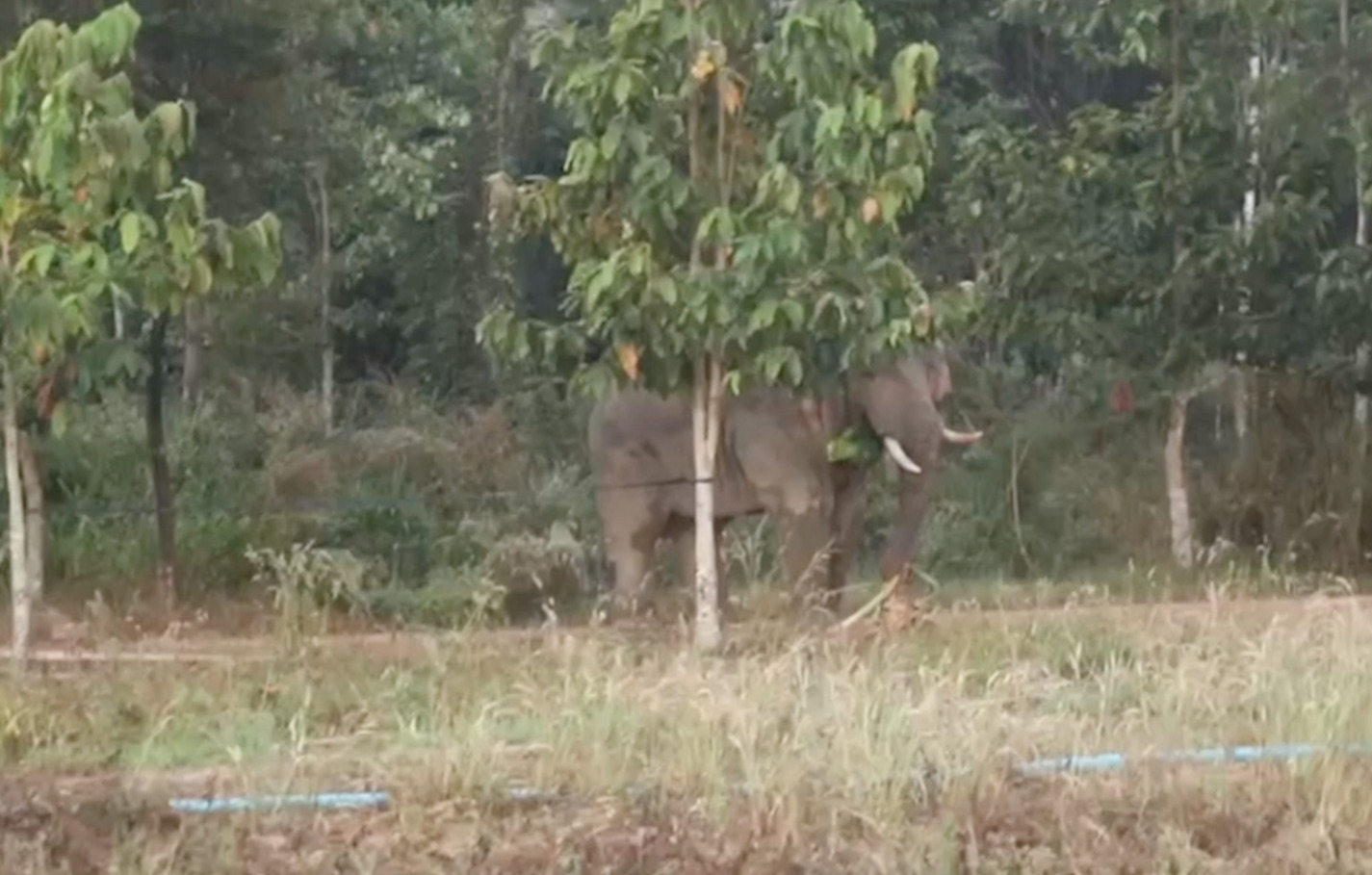 นครราชสีมา 13 ม.ค.- “เจ้างาเบี่ยง” บุกบ้าน แม้การ์ดหน้าบ้านอย่างเจ้าตูบจะพยายามเห่าไล่ แต่ไม่เป็นผล จนต้องเผ่นหนี ช้างป่างาเบี่ยงยังเดินหน้าล้มต้นมะพร้าว ทิ้งให้ดูต่างหน้าก่อนหนีไป