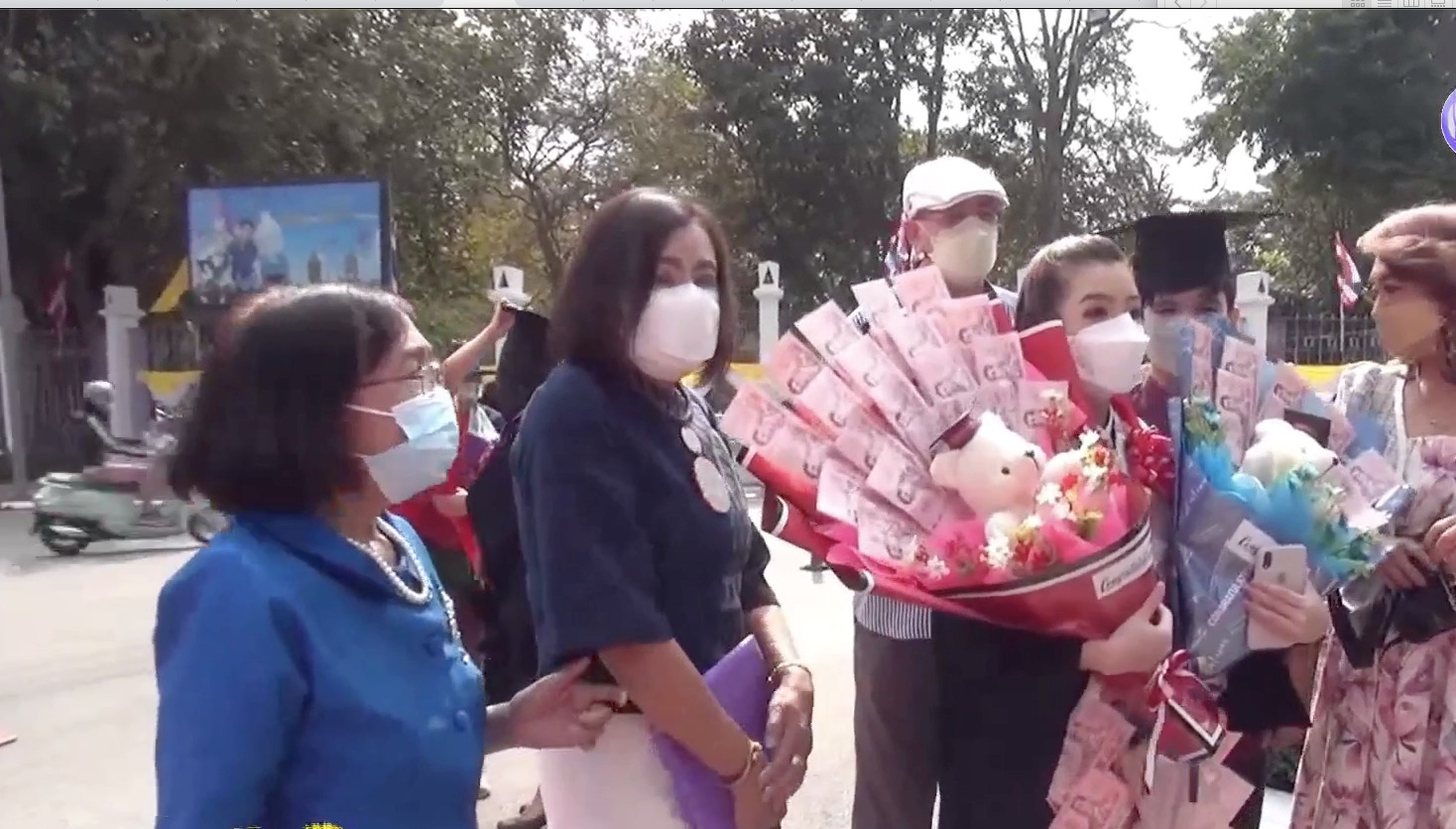แต่หากเป็นผู้ปกครอง หรือญาติผู้ใหญ่ ก็จะซื้อช่อดอกทำจากธนบัตร ใบละ 100 หรือ 1,000 หากมีจำนวนเงิน 2,000 บาท ก็จะขายราคา 2,200 บาท หรือเป็นธนบัตร ฉบับละ 20 บาท ใช้คล้องคอ มูลค่า 200 บาท ก็จะขาย 300 บาท ธนบัตร 50 บาท จำนวน 10 ใบ ก็จะขาย 700 บาท บัณฑิตบางคนมีญาติผู้ใหญ่เยอะก็จะได้ทั้งช่อดอกที่เป็นเงิน หรือพวงมาลัยคล้องคอ ที่เป็นเงินด้วย