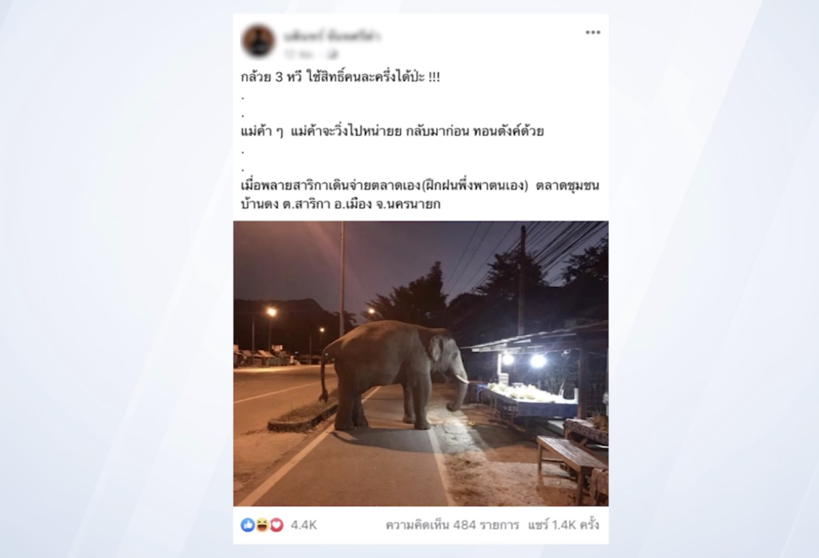 ลุงหมูสาริกา คนโพสต์เล่าว่า พลายสาริกา เป็นช้างป่าเพศผู้จากอุทยานแห่งชาติเขาใหญ่ มาอยู่ในแนวชุมชนของชาวบ้าน ประมาณ 6 ปีแล้ว โดยเจ้าหน้าที่ได้จัดชุดเฝ้าระวังตลอด ซึ่งพลายสาริกาไม่เคยทำร้ายชาวบ้าน แต่ชอบเข้าสวนกินกล้วยและผลไม้ของชาวบ้าน เหตุการณ์นี้เกิดขึ้นประมาณตี 5 ครึ่งของวันที่ 15 ที่ผ่านมา เป็นช่วงที่พลายสาริกากำลังจะเดินกลับเข้าป่า แต่บังเอิญเห็นตลาดนัดเช้าของชุมชน และผ่านมาที่หน้าร้านขายกล้วย จึงหยุดที่หน้าร้านและมีลักษณะเหมือนมาขอกล้วย แต่ทางเจ้าของร้านเมื่อเห็นช้างมาด้วยความตกใจก็หายตัวไปจากแผงทันที ส่วนพลายสาริกาหยุดยืนหน้าร้านประมาณ 1-2 นาที ทางทีมกลุ่มเฝ้าระวังเพื่อนช้างจังหวัดนครนายกก็ เข้ามาช่วยกันผลักดันให้กลับเข้าป่าไป โดยไม่มีอะไรเสียหาย.-สำนักข่าวไทย