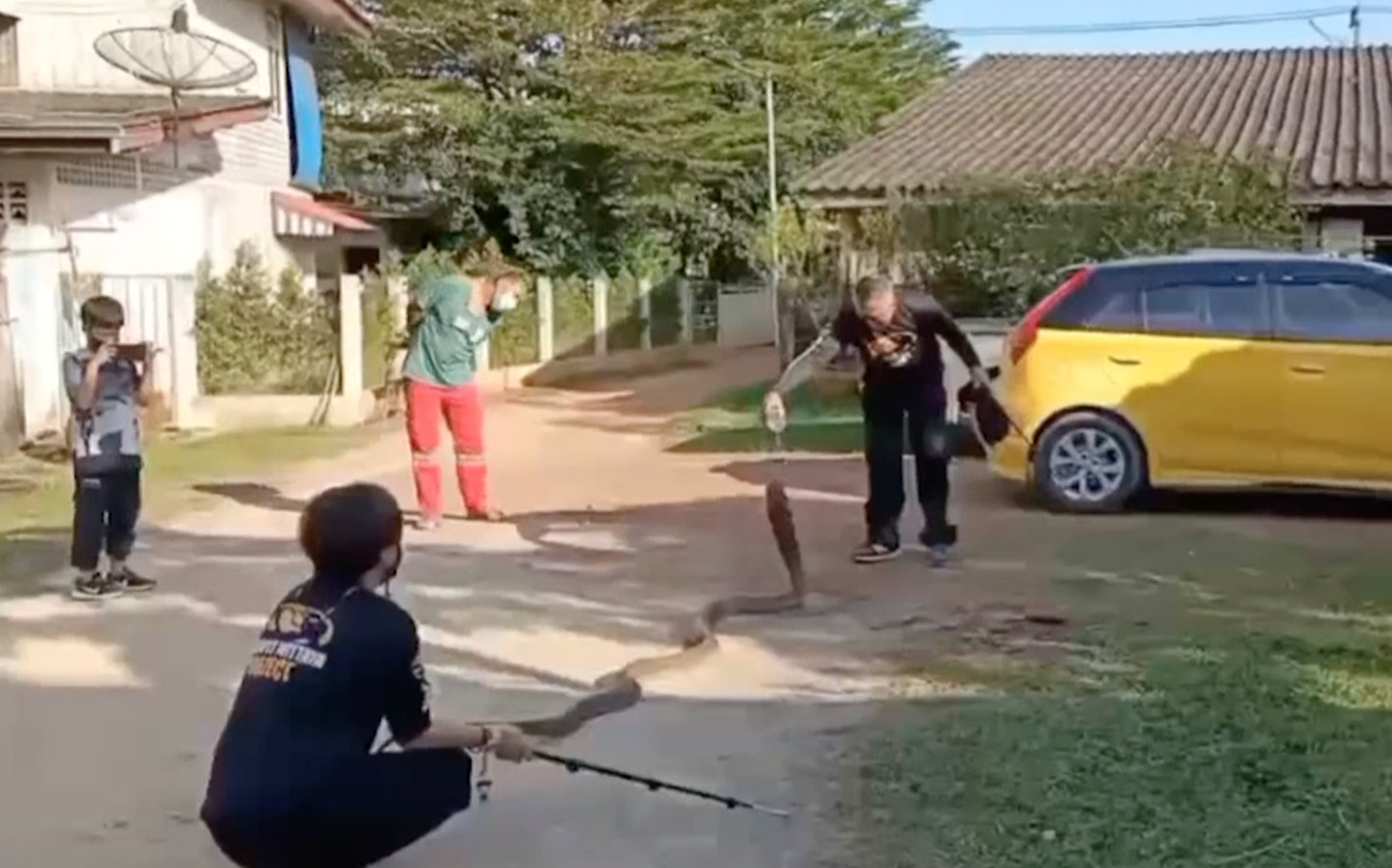 เจ้าหน้าที่ชุดจับอสรพิษ สมาคมกู้ชีพร่วมใจย่านตาขาว จ.ตรัง รีบไปที่บ้านเลขที่ 71/1 หมู่ 8 ต.นาชุมเห็ด อ.ย่านตาขาว ของนางอำไพ อายุ 63 ปี หลังรับแจ้งมีงูจงอางเลื้อยเข้ามาในบ้านและซุกอยู่ใต้กระถางต้นไม้ หลังรื้อกระถางออกพบงูจงอางตัวใหญ่นอนขดตัวอยู่ นายวุฒิชัย พรเพิ่มสุข เจ้าหน้าที่ชุดจับอสรพิษสมาคมกู้ชีพร่วมใจย่านตาขาว ได้ใช้มือจับด้วยความชำนาญใช้เวลาเพียงแค่ 15 นาที จับงูได้สำเร็จ วัดขนาดงูยาว 4.2 เมตร น้ำหนักประมาณ 20 กิโลกรัม