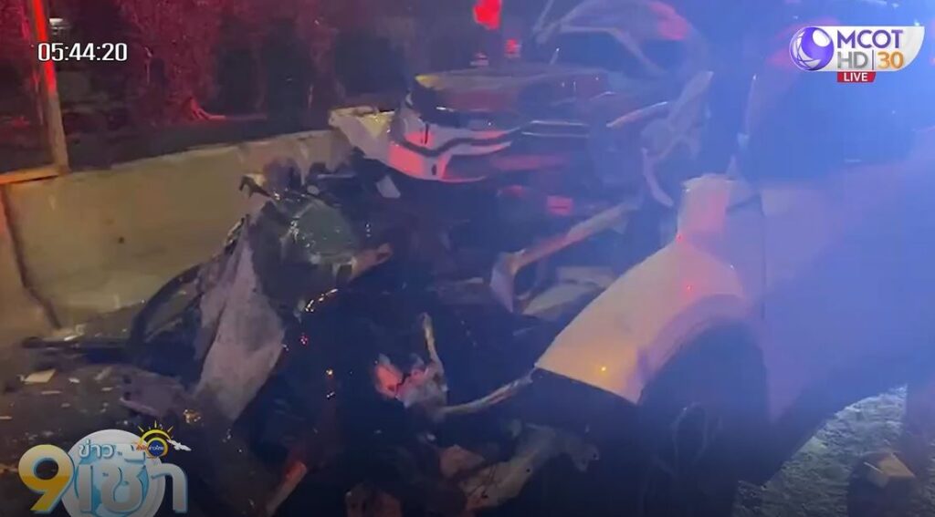 เก๋งซิ่งชนท้ายสิบล้อแหลกครึ่งคัน
