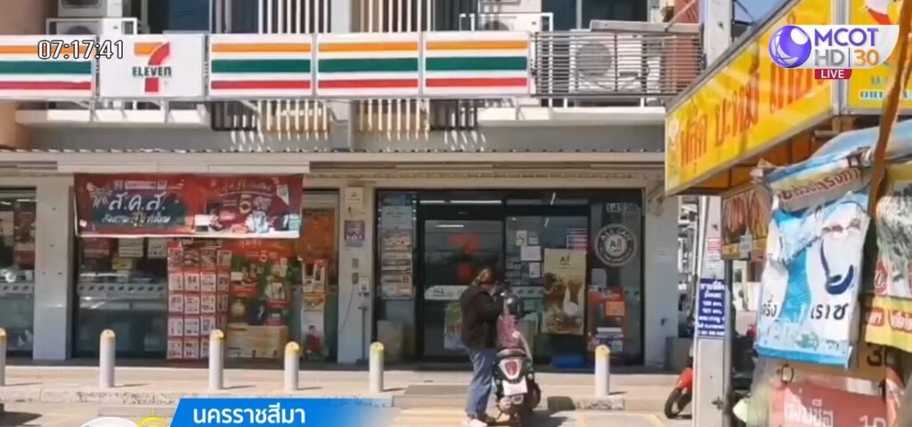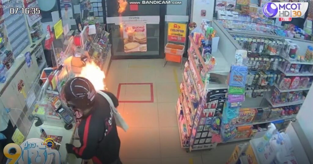 เมื่อเวลา 03.00 น.ที่ผ่านมา ภาพวงจรปิดเผยให้เห็นคนร้ายบุกเข้าไปชิงทรัพย์ภายในร้านสะดวกซื้อแห่งหนึ่ง ตั้งอยู่บนถนนทางเข้ามหาวิทยาลัยเทคโนโลยีสุรนารี อ.เมือง จ.นครราชสีมา คนร้ายเป็นชายฉกรรจ์ สวมเสื้อแขนยาวสีดำแถบแดง สวมหมวกกันน็อก กางเกงขายาว เดินเข้าไปที่หน้าเคาน์เตอร์เก็บเงิน ก่อนราดน้ำมันและจุดไฟแช็ก เกิดไฟลุกไหม้หน้าเคาน์เตอร์ และข่มขู่พนักงานในร้าน พร้อมยื่นถุงพลาสติกให้เก็บเงินใส่ แต่พนักงานในร้านตกใจ ถอยหนีไปนั่งร้องไห้