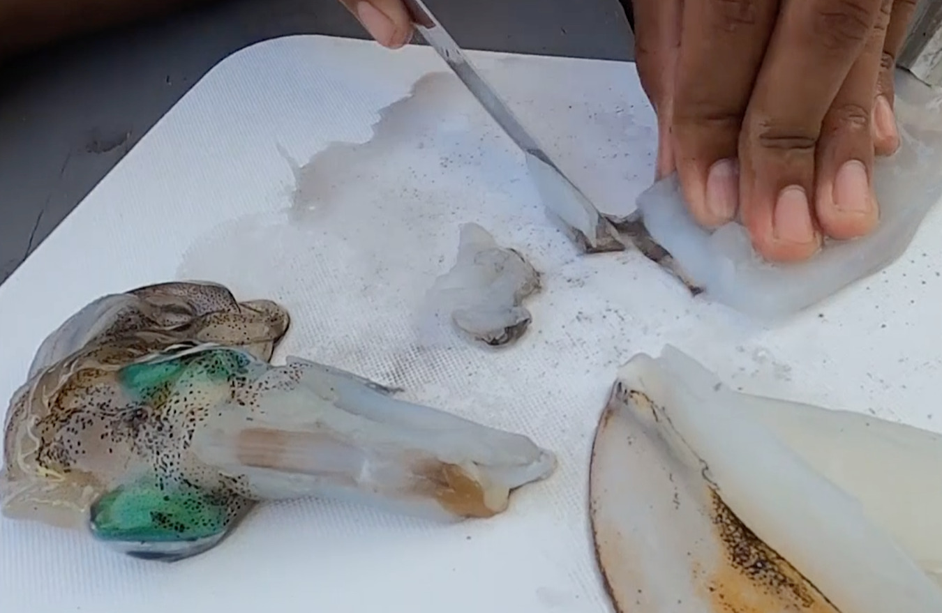 เนื้อสัมผัสของหมึกสดๆ จะมีความหวานกรอบ กรึบๆ กินกันท่ามกลางน้ำทะเลสีเขียวมรกต ท้องฟ้าที่สวยงามและแสงแดดที่สดใส รายล้อมด้วยฝูงปลาน้อยใหญ่ ทำให้บรรยากาศสุดฟิน