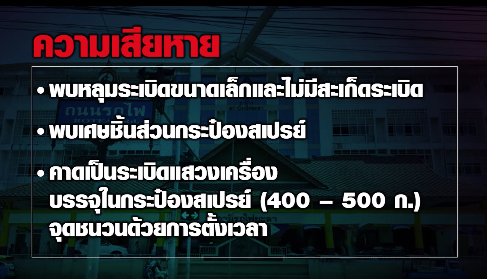 จากการตรวจสอบเบื้องต้น พบเป็นระเบิดแสวงเครื่องบรรจุในกระป๋องสเปรย์ น้ำหนัก 400 – 500 กรัม จุดชนวนด้วยระบบการตั้งเวลาด้วย IC TIMER ไม่มีสะเก็ดระเบิด และมีแต่เพียงเสียงดัง เชื่อว่าน่าจะเป็นการปั่นป่วนสร้างสถานการณ์