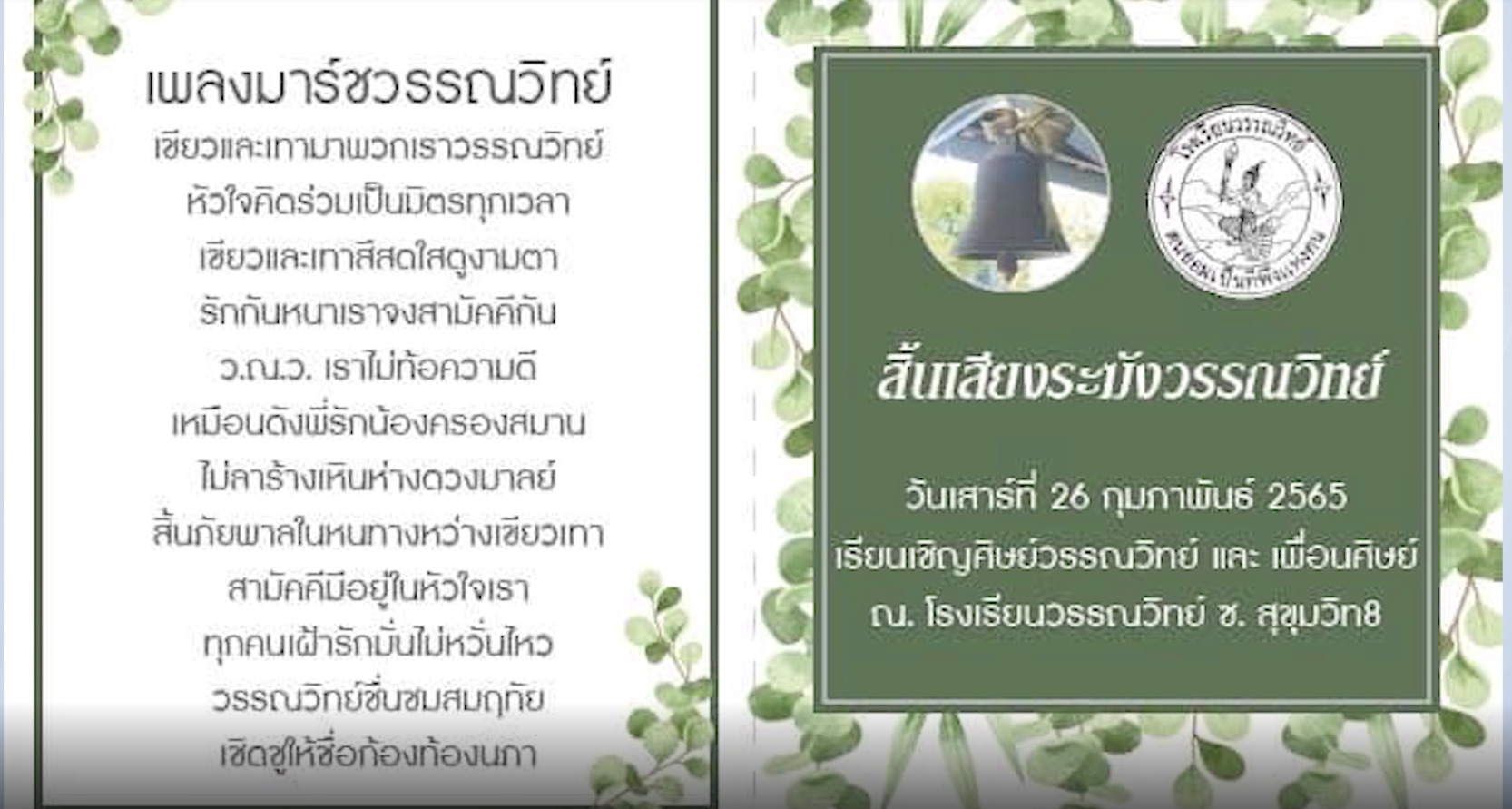 กรุงเทพฯ 22 ม.ค.- ปิดตำนาน 76 ปีโรงเรียนวรรณวิทย์ โรงเรียนไม้เล็กๆ ใจกลางสุขุมวิท เพจเฟซบุ๊ก “ศิษย์เก่าโรงเรียนวรรณวิทย์” โพสต์แจ้งข่าวการจัดงานสิ้นเสียงระฆังวรรณวิทย์ ในวันเสาร์ที่ 26 กุมภาพันธ์นี้ เวลา 10.00 น. เป็นต้นไป ณ โรงเรียนวรรณวิทย์ สุขุมวิทซอย 8 จึงขอเรียนเชิญศิษย์วรรณวิทย์ และเพื่อนศิษย์ทุกท่านร่วมงาน พบกันอีกครั้ง เราจะคิดถึงกันตลอดไป