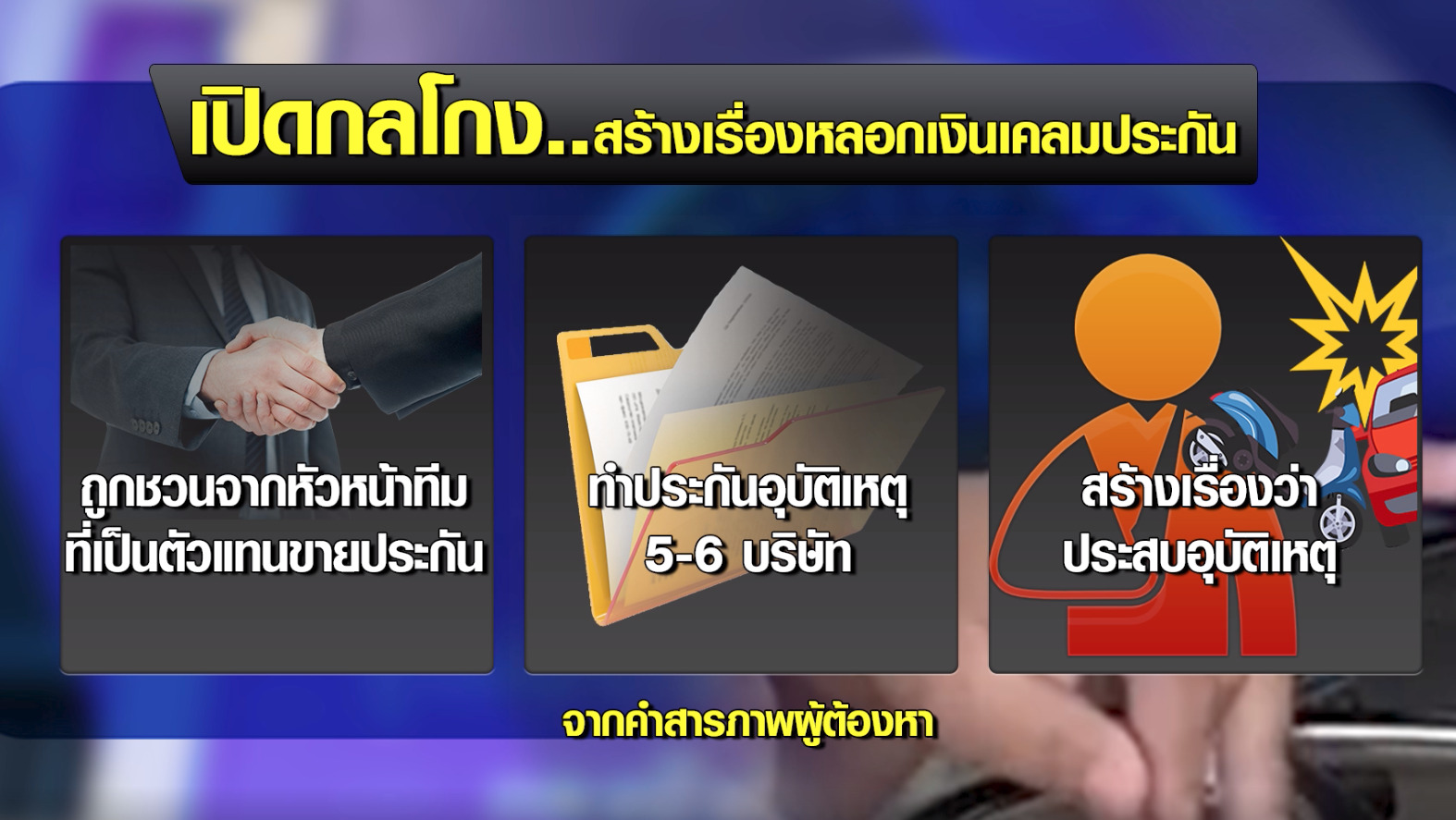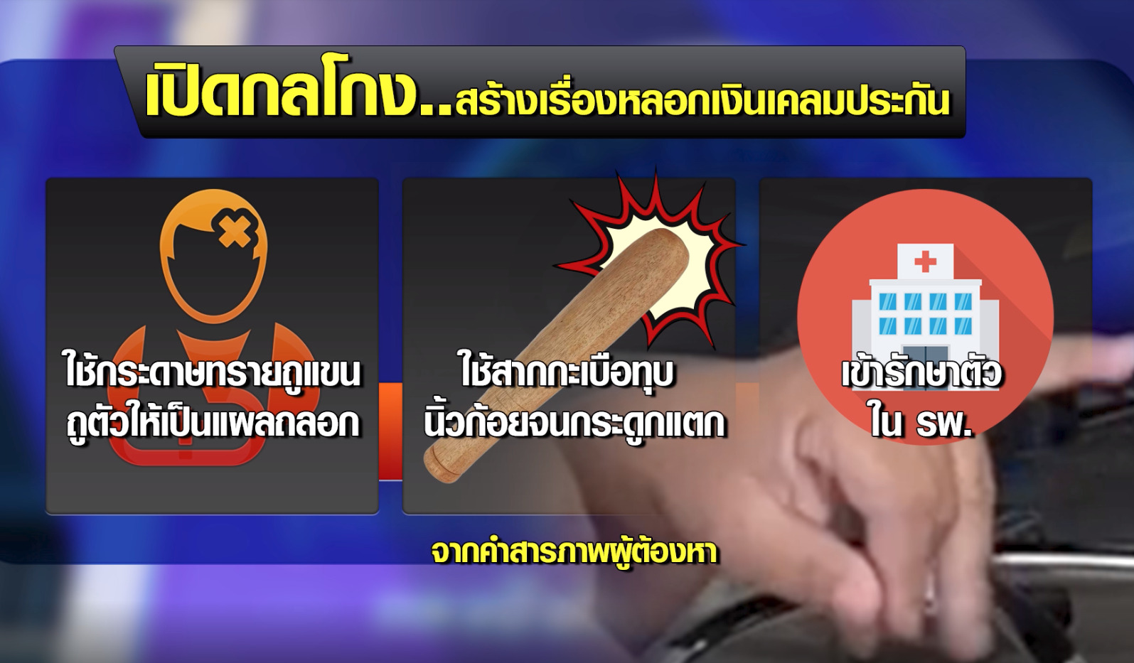 วิธีการเริ่มจากหาคนมาทำประกันอุบัติเหตุกับบริษัทประกันภัยต่างๆ คนละหลายกรมธรรม์ บางคน 6 กรมธรรม์ บางคน 10 กรมธรรม์ แล้วสร้างเรื่องให้เกิดอุบัติ เช่น ทำเป็นอุบัติเหตุรถล้ม เอาน้ำร้อนราดขา เอาน้ำแกงส้มร้อนๆ ราดมือราดตัว หรือตกจากรถเพื่อให้ดูเหมือนว่าเกิดอุบัติเหตุ แล้วพาเข้ารักษาตัวที่โรงพยาบาล และทำเรื่องเบิกค่าสินไหมทดแทนกับทางบริษัทประกัน โดยจะแบ่งให้กับผู้ทำประกันส่วนหนึ่งอีกส่วนหนึ่งหัวหน้าทีมที่เป็นตัวแทนขายประกันก็จะเอาไป.-สำนักข่าวไทย