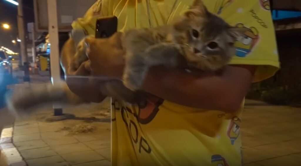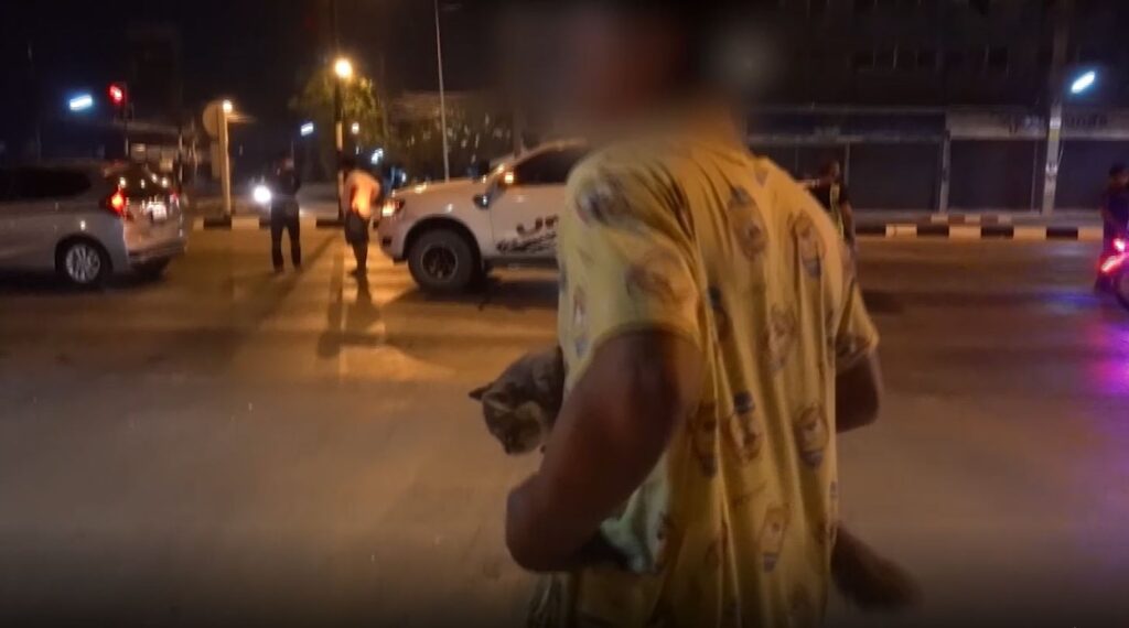 สังเกตว่า หนุ่มคนนี้หาเรื่องเขาไปทั่ว มึนไปหมด ทั้งๆ ที่หนุ่มเสื้อขาว เป็นคนช่วยเรียกเจ้าหน้าที่กู้ภัย แต่พอถามถึงแมว เขาเปลี่ยนไปเป็นคนละคน ทำเสียงสอง บอกว่า น้องเป็นตัวผู้ แต่ด้วยความเมา เราจึงฟังไม่ถนัดว่า แมวชื่ออะไร