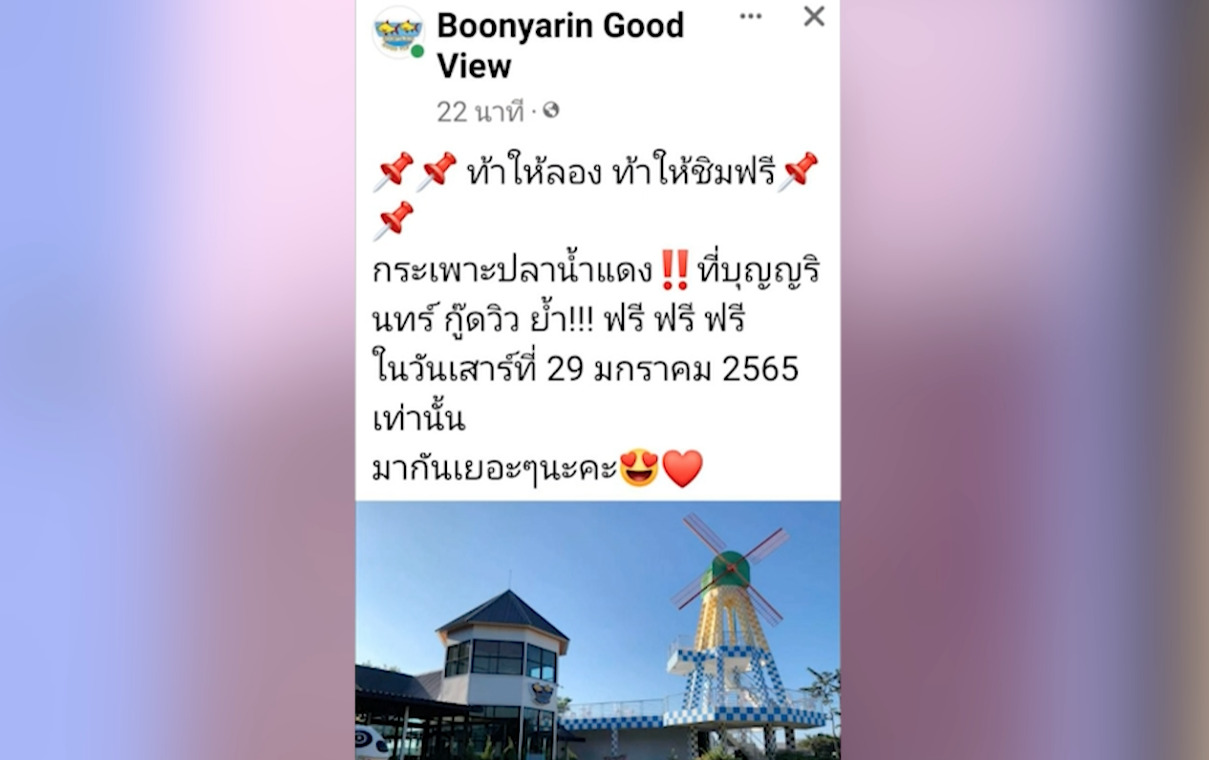 ต่อมาเฟซบุ๊ก “Boonyarin Good View” ลงข้อความพร้อมภาพร้านบุญญรินทร์ กู๊ด วิวว่า “ท้าให้ลอง ท้าให้ชิมฟรี กระเพาะปลาน้ำแดง ที่บุญญรินทร์กู๊ดวิว ย้ำ! ฟรี ฟรี ฟรี ในวันเสาร์ที่ 29 มกราคม 2565 เท่านั้น มากันเยอะๆ นะคะ”.-สำนักข่าวไทย