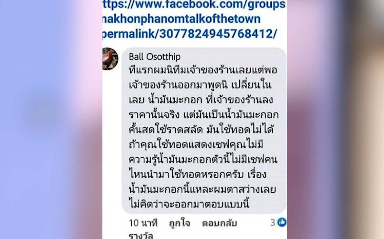 ส่วนรูปน้ำมันมะกอกราคาขวดละ 2,000 บาทที่ใช้ทอดปีกไก่และเนื้อโคขุนที่เจ๊บิวโชว์ ปรากฏว่ามีผู้รู้ใช้ชื่อ “Ball Osotthip” ตอบคอมเมนต์ใต้เฟซบุ๊ก “Boonyarin Good View” ว่า “ทีแรกผมนี่ทีมเจ้าของร้านเลย แต่พอเจ้าของร้านออกมาพูดนิเปลี่ยนไปเลย น้ำมันมะกอกที่เจ้าของร้านลงราคานั้นจริง แต่มันเป็นน้ำมันมะกอกคั้นสดใช้ราดสลัด มันใช้ทอดไม่ได้ ถ้าคุณใช้ทอดแสดงว่าเชฟคุณไม่มีความรู้น้ำมันมะกอกตัวนี้ ไม่มีเชฟคนไหนนำมาใช้ทอดหรอกครับ เรื่องน้ำมันมะกอกนี่แหละผมตาสว่างเลย ไม่คิดว่าจะออกมาตอบแบบนี้”