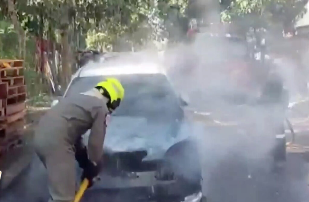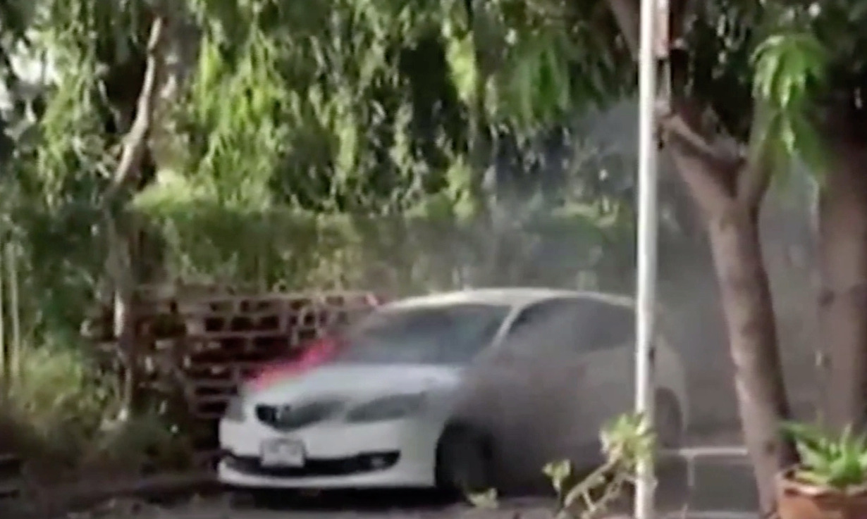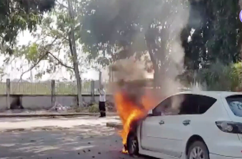 คลิปวิดีโอที่ น.ส.นันทิชา คนถ่ายคลิปผ่านมาพบและบันทึกเหตุการณ์รถเก๋งที่จอดอยู่ภายในหมู่บ้านเอื้ออาทร เกิดมีกลุ่มควันและเกิดไฟลุกไหม้ขึ้นอย่างรุนแรง ที่เกิดเหตุอยู่ภายในหมู่บ้านเอื้ออาทรพานทองหมู่ที่ 5 ต.พานทอง อ.พานทอง จ.ชลบุรี เจ้าหน้าที่กู้ภัยกำลังช่วยดับไฟที่กำลังลุกไหม้พบรถยนต์เก๋ง mazda3 สีขาว โดยใช้เวลาประมาณ 10 นาที จึงสามารถควบคุมเพลิงเอาไว้ได้ สภาพภายในห้องเครื่อง และภายในรถช่วงคอนโซลหน้าถูกไฟไหม้เสียหายทั้งหมด