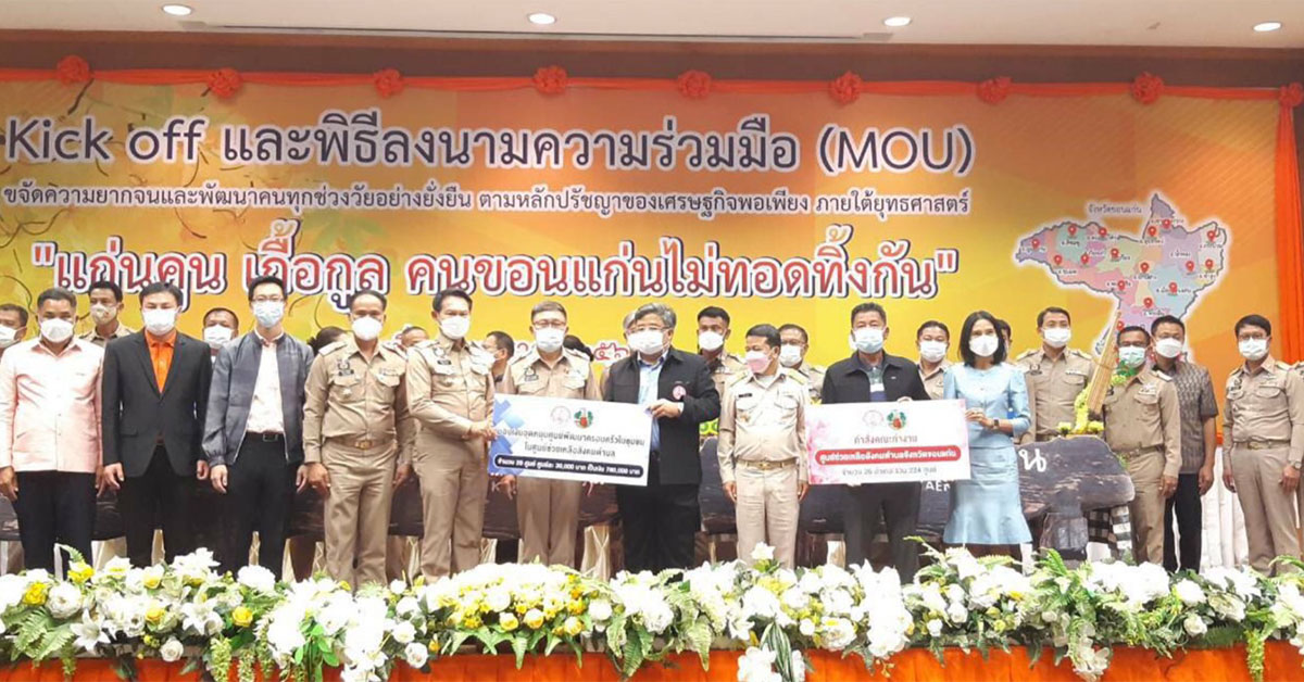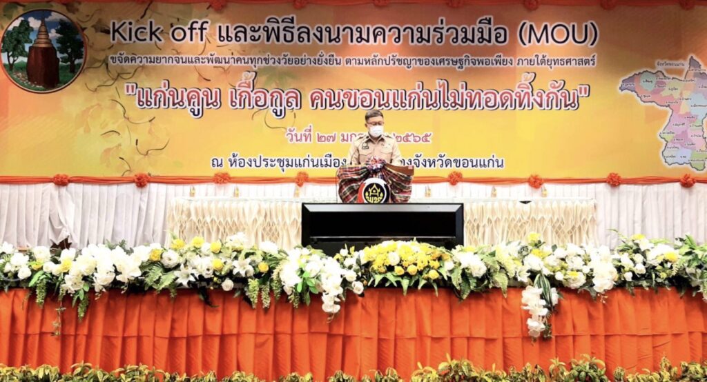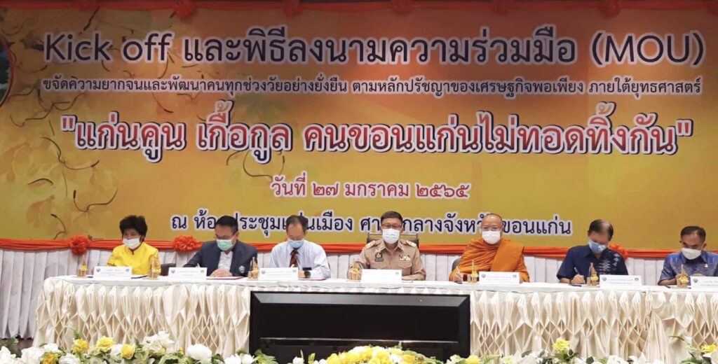 ขอนแก่น 27 ม.ค.- ผู้ว่าฯ ขอนแก่น เป็นประธาน Kick Off ลงนามประสานความร่วมมือ (MOU) ขจัดความยากจนและพัฒนาคนทุกช่วงวัยอย่างยั่งยืน ตามหลักปรัชญาเศรษฐกิจพอเพียง ภายใต้ยุทธศาสตร์ “แก่นคูน เกื้อกูล คนขอนแก่นไม่ทอดทิ้งกัน” บูรณาการขับเคลื่อนศูนย์ช่วยเหลือสังคมตำบลในทุกๆ ด้านให้กับ 360 ครอบครัว มีชีวิตและความเป็นอยู่ที่ดีขึ้น