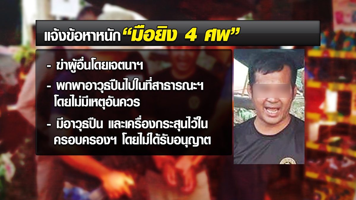 เบื้องต้นแจ้ง 3 ข้อหา คือ ฆ่าผู้อื่นโดยเจตนา พกพาอาวุธปืนไปในที่สาธารณะโดยไม่มีเหตุอันควร และมีอาวุธปืนพร้อมเครื่องกระสุนปืนไว้ในครอบครองโดยไม่ได้รับอนุญาต โดยปืนที่ใช้ก่อเหตุ ตรวจพบว่าเป็นปืนที่มาจาก จ.ลพบุรี แต่ยังอยู่ระหว่างตรวจสอบที่มาที่ไป หากพบหลักฐานอื่นอีก จะต้องแจ้งข้อหาเพิ่ม. – สำนักข่าวไทย