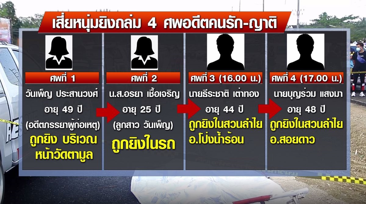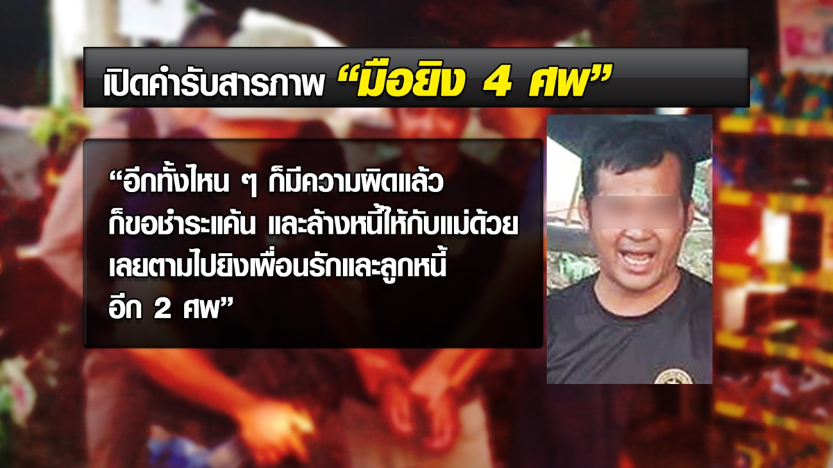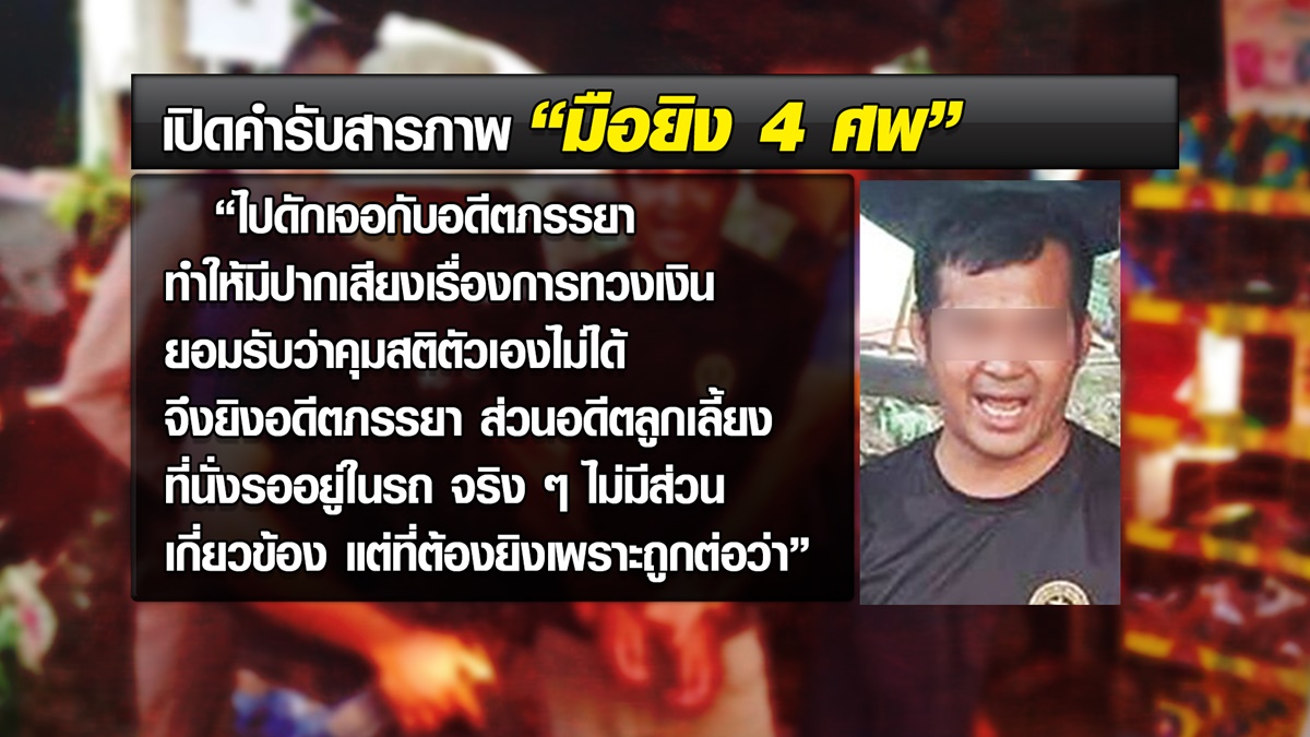 วันก่อเหตุ (30 ม.ค.) ได้ขี่มอเตอร์ไซค์มาดักรออดีตภรรยาและลูกเลี้ยง ที่ตลาดนัดบ้านตามูล เพราะทราบว่าทั้งคู่จะมาซื้อกับข้าวที่นี่ กระทั่งอดีตภรรยาลงมาจากรถ เขาจึงปรี่เข้าไปยิง 2 นัด จากนั้นตรงไปยิงลูกเลี้ยงอีก 3 นัด พอแน่ใจว่าทั้งหมดเสียชีวิตแล้ว ก็ได้ขับรถของอดีตภรรยาไปยิงนายธีระชาติ ที่สวนลำไย อ.โป่งน้ำร้อน โดยสาเหตุที่ยิงนายธีระชาติ เพราะยืมเงินของแม่ผู้ต้องหาไป 40,000 บาท แต่ไม่ยอมคืน อ้างไม่มีเงิน แต่ผู้ต้องหาเห็นว่าเพิ่งออกรถป้ายแดง ต่อมาเห็นว่าไหนๆ ก็ยิงหลายคนแล้ว จึงขับรถไปก่อเหตุยิงนายบุญร่วมอีกคน เหตุเพราะแค้นที่หลอกขายปืนปลอม ในราคา 17,000 บาท แถมพอไปขอเงินคืน บอกจะเอาแค่ 7,000 บาท กลับถูกปฏิเสธ ทำให้ต้องยิงนายบุญร่วม เป็นศพที่ 4 พร้อมย้ำว่า ตลอดการก่อเหตุ รถที่ขับไปนั้นมีศพของลูกเลี้ยงติดรถไปด้วยทุกที่ เพราะลูกเลี้ยงเสียชีวิตคารถ แล้วไม่รู้จะเอาไปทิ้งไว้ที่ไหน รวมถึงเล่าอย่างไม่สะทกสะท้านด้วยว่า หลังก่อเหตุได้ไปนั่งดื่มเหล้า และหากไม่ถูกจับเสียก่อน คิดไว้แล้วว่าจะไปยิงคนที่แค้นอีก 1 คน แถมยังย้ำว่า เหยื่อทุกคนสมควรตายแล้ว โดยเฉพาะอดีตภรรยาที่เวลาอยู่ด้วยกันชอบทำเหมือนตัวเขาไม่ใช่คน