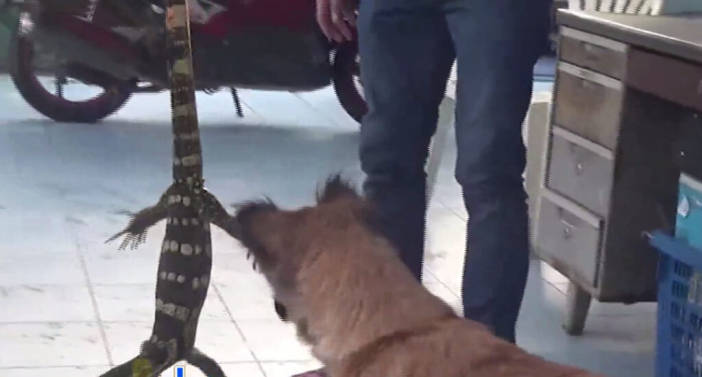พบตายายยืนรออยู่หน้าบ้าน พาเจ้าหน้าที่ไปชี้จุดที่ตัวเงินตัวทองหลบซ่อนอยู่หลังแท็งก์น้ำซอกรั้วบ้าน เจ้าหน้าที่จึงปีนรั้วบ้านขึ้นไปดู ใช้ไม้เขี่ยไล่ไห้ออกมา ตัวเงินตัวทองตกใจวิ่งออกมา เจ้าหน้าที่ที่คอยดักจับก็พลอยตกใจกระโดดหนีไปด้วย โดยมีหมาวิ่งไล่ตามมาจะกัดตัวเงินตัวทอง เจ้าหน้าที่ต้องไล่ออกไป ทำให้ตัวเงินตัวทองวิ่งเข้าไปซุกอยู่ใต้โต๊ะ แต่เจ้าหน้าที่ก็คว้าหางไว้ได้ในที่สุด ก่อนจับใส่ถุงปล่อยคืนธรรมชาติต่อไป